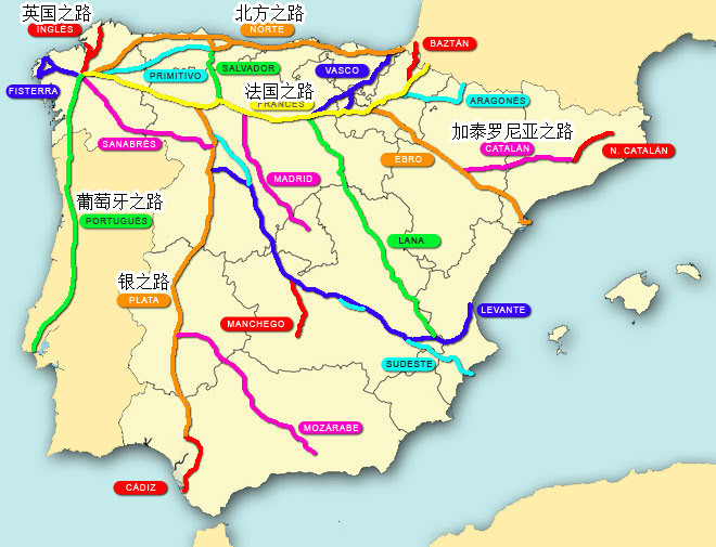 到达圣地亚哥的主要途径有我们这次走的“北方之路”(从西法边境小镇昂代出发),最流行的“法国之路”(也可以叫内路线),“加泰罗尼亚之路”(从巴塞罗那出发),“英国之路”,“葡萄牙之路”和“银之路”(从西班牙塞维利亚出发)等等。