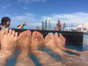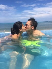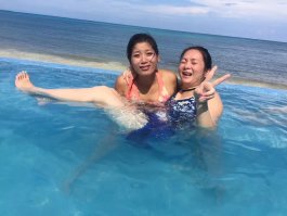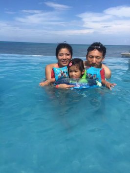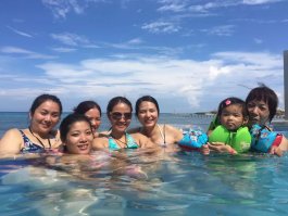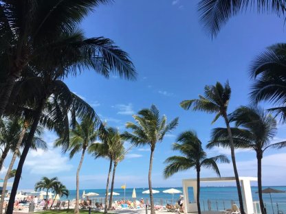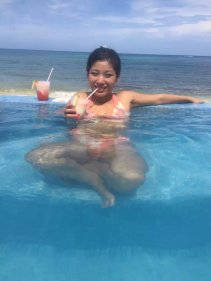 吃完饭收到酒店发来的房间号码短信。(美国T-MOBILE手机到那边短信,网络都是免费的)。直接去了前台把房间号码给他们,他们会把行李送到房间。 房间安排在10层,景好美 ,全部都是海景房,并且全部都把我们安排在隔壁。大家进出都好方便。 快速换好泳衣大家一起冲下去沙滩拍照玩水,顺便在泳池吧台叫个pina colada喝喝。看看那蓝蓝的天,蓝蓝的海, 什么都蓝蓝的,一切疲劳都不见了。