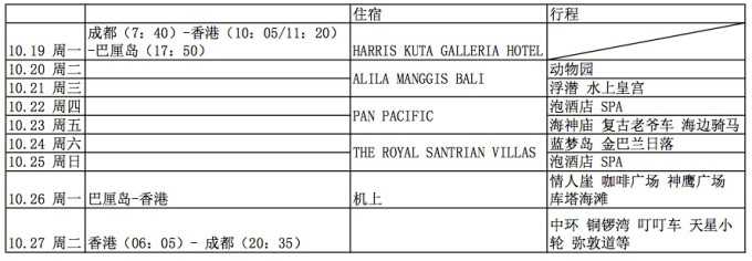 【行程费用】14000RMB/人,不含巴厘岛自费购物及香港游玩的费用。