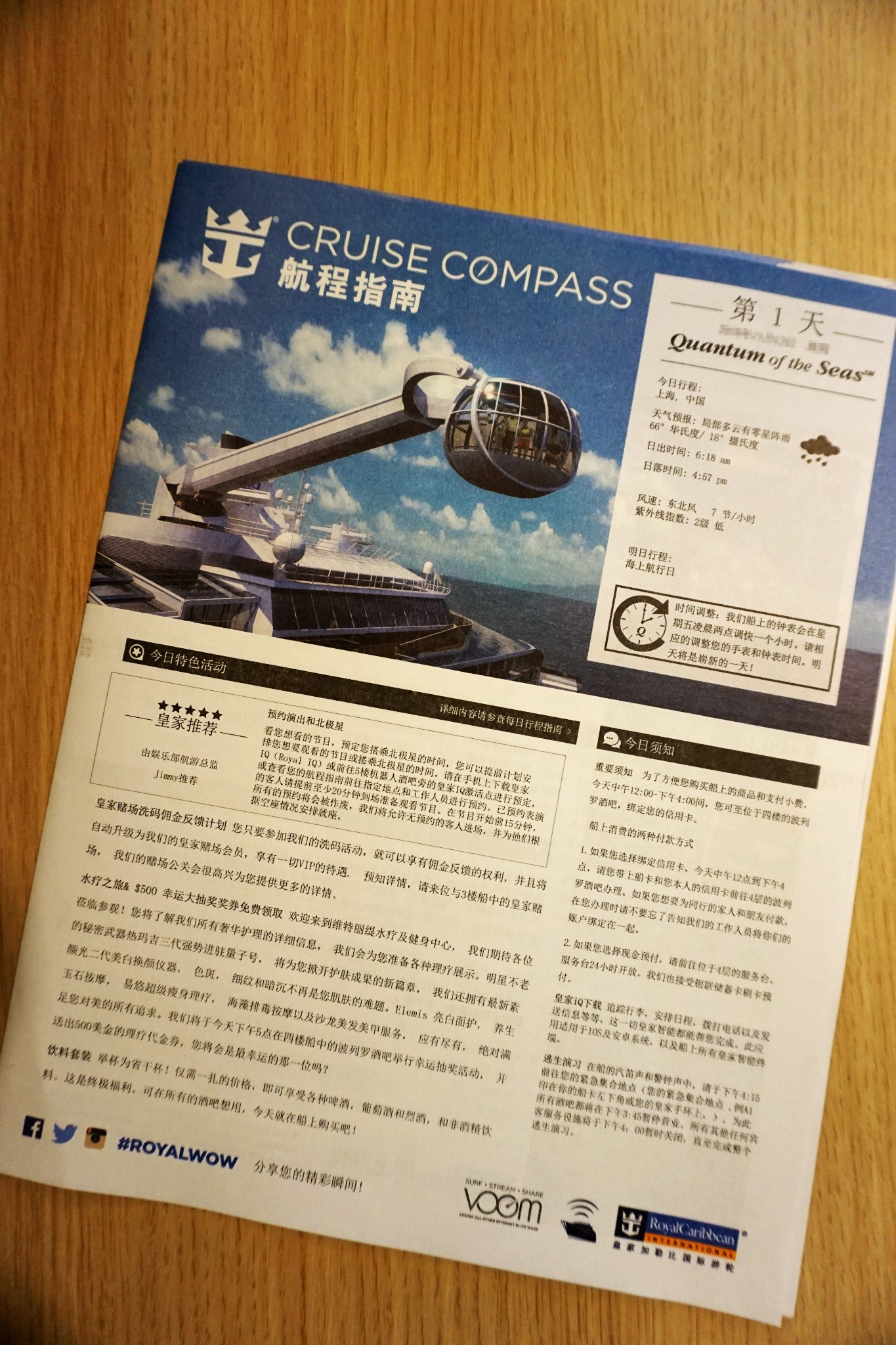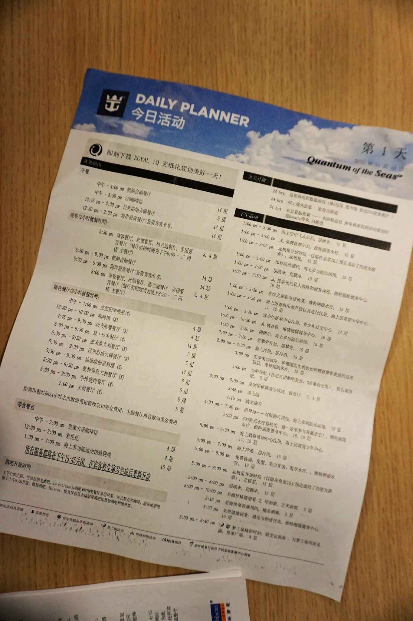 这两个文件极其重要,他们标明了当天所有的活动项目,开放餐厅,娱乐演出等各种信息。是游客在船上活动的重要指南。