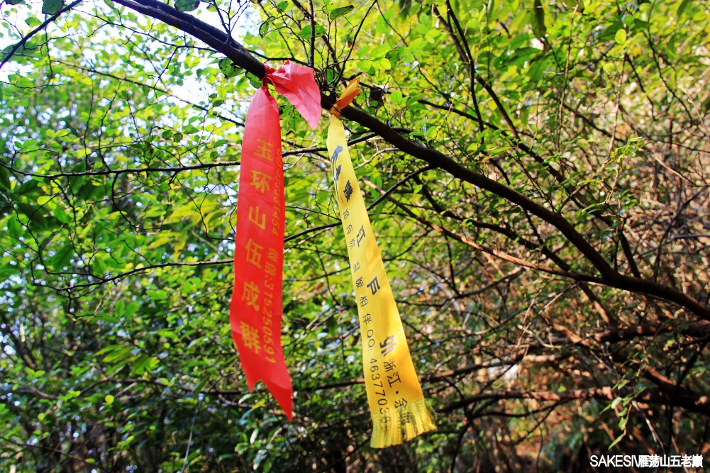 几次走到岔道口,不知该望哪走,犹豫的时候刚好可以歇一会,给萨克斯补充水分,我的原则是,不管什么岔道口,往坡度陡的线路走,应该是登山顶的,果然没走一会,沿途见到驴友的信号彩带。