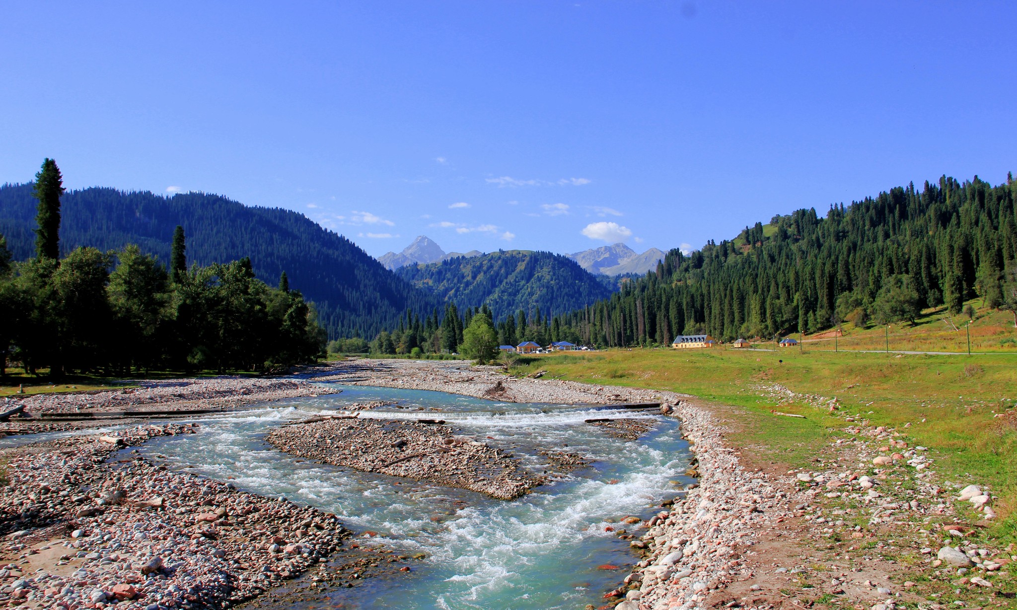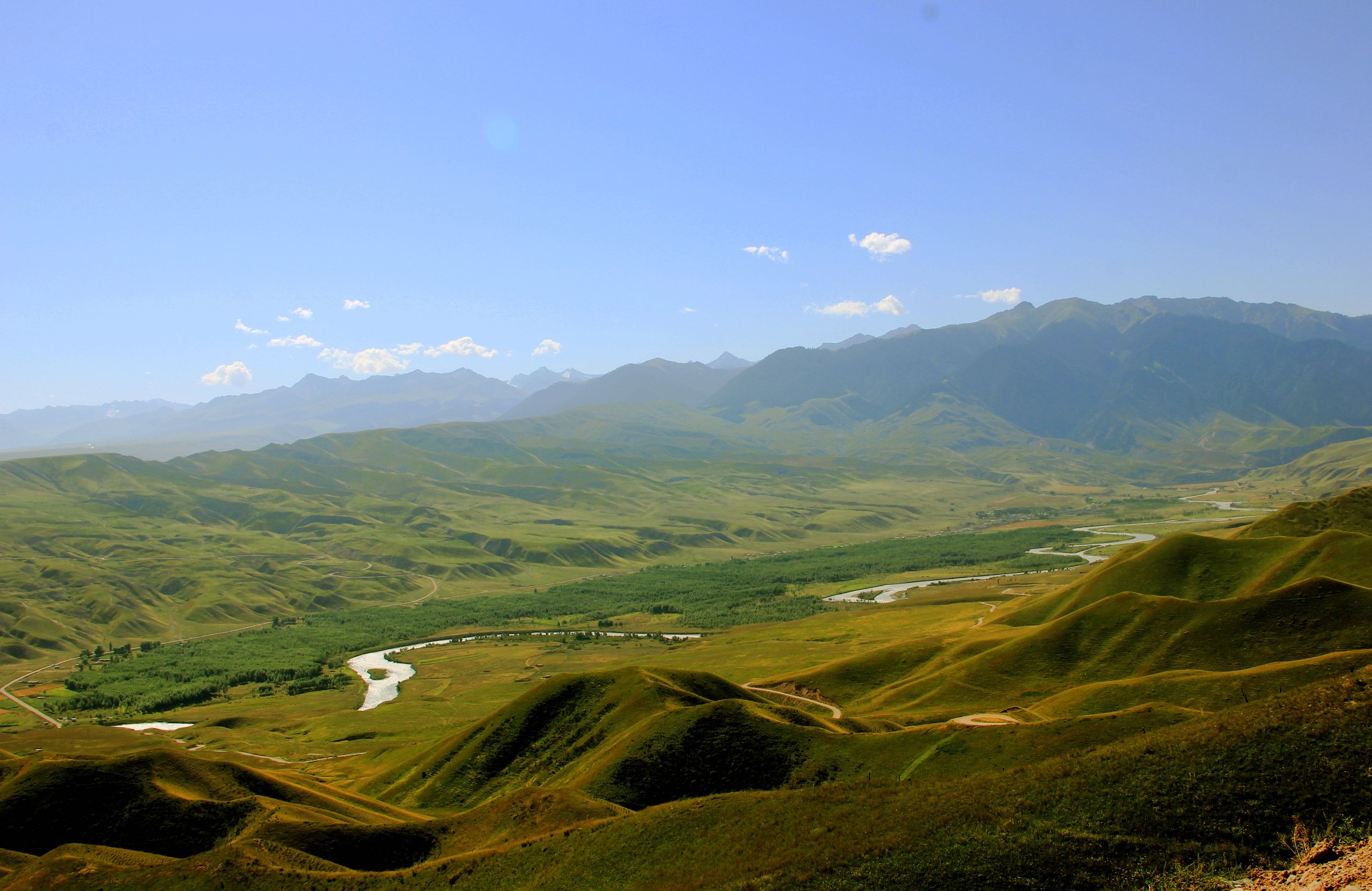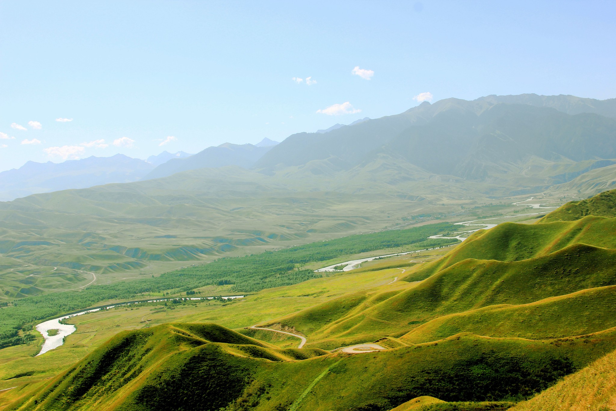 一进入特克斯南部的山区,便是无尽的盘山砂石路,当车子快到琼库台草原时,从高高的山上往山下看,便可看到库尔代河的“小九曲十八湾”,它虽然名气没有巴音布鲁克草原的九曲十八湾大,但显得更蜿蜒多姿,更恬静。