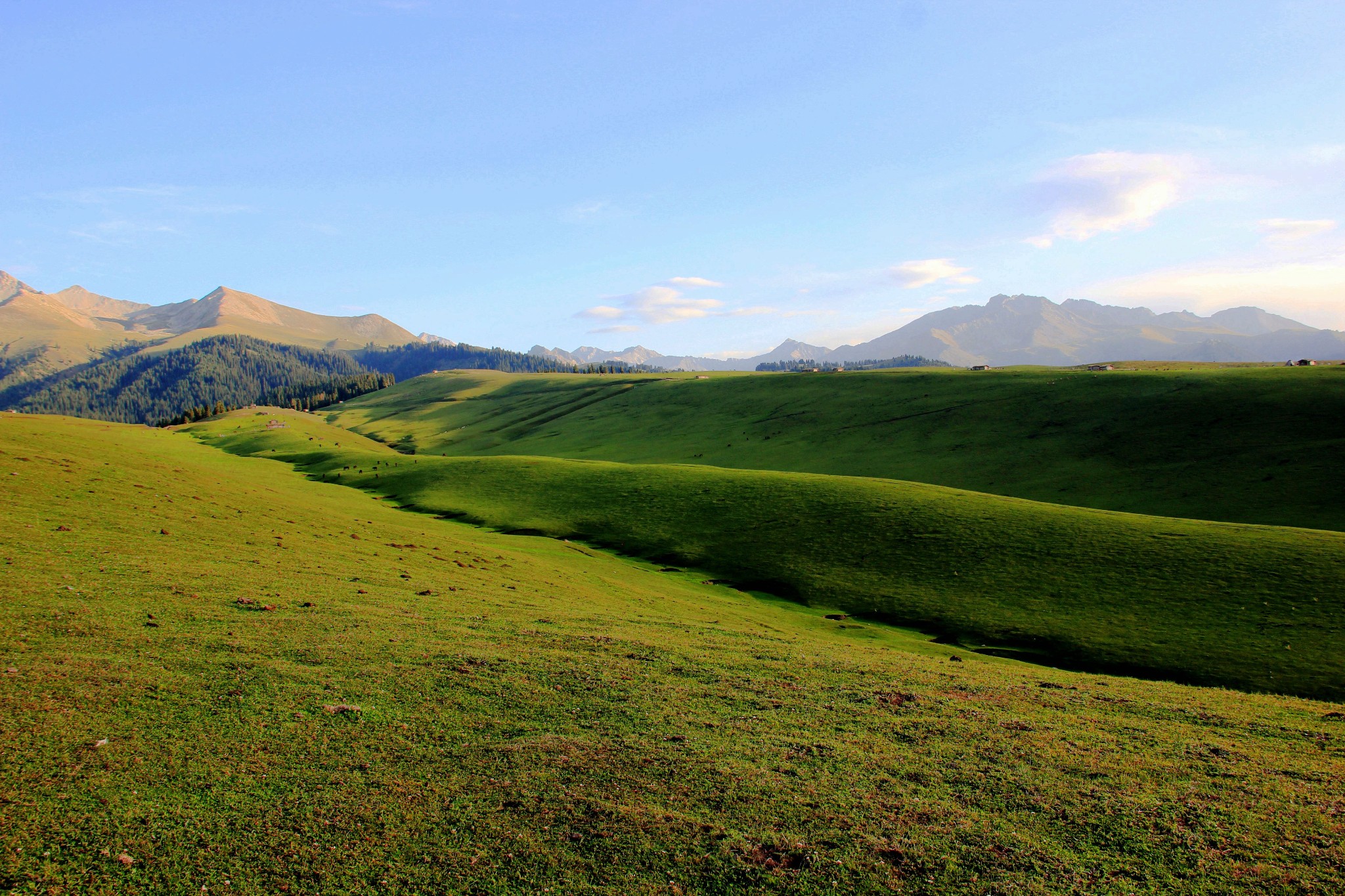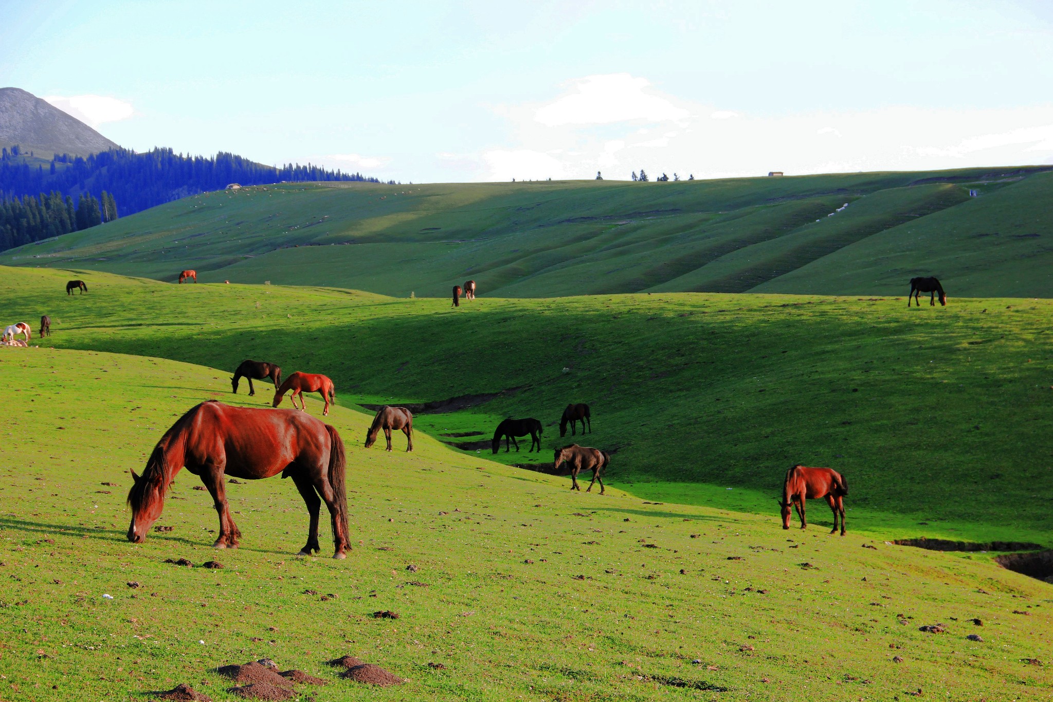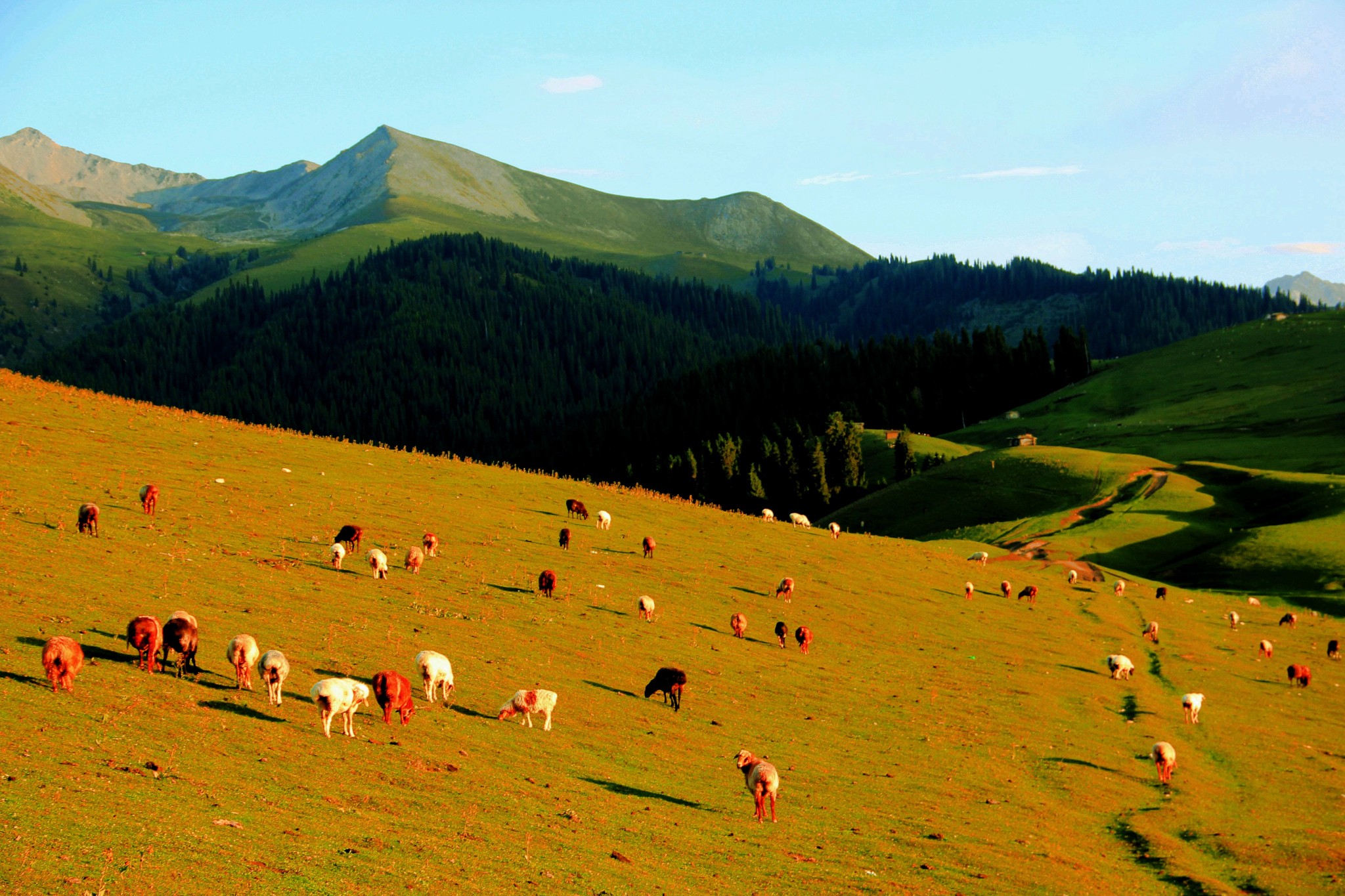 小琼库什台草原被纵向切出无数的壑沟,翻过一条沟,或翻过一座山,又是一大片草原,被称为天山下最大、最原始、最纯净质朴的大草原。当金黄色的阳光,铺洒在壑沟纵横的草原上,光线将草原勾勒出梦幻的迷人曲线,满山遍野的马、牛、羊悠然自得地在绿草茵茵的草地上吃草,构成一幅幅让人心动的画面。
