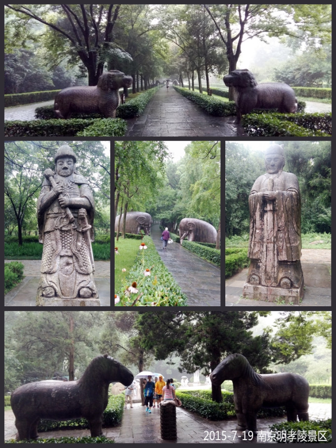 。虽然夏季的景色不如秋季的灿烂多彩,却有一种生机勃勃的景象,雨丝中漫步在石像路上也别有一番趣味,景区里人很少,大多是锻炼的南京市民,像我们这样的游客很少。有位去晨练的和蔼老伯还为我们带路去看像路。