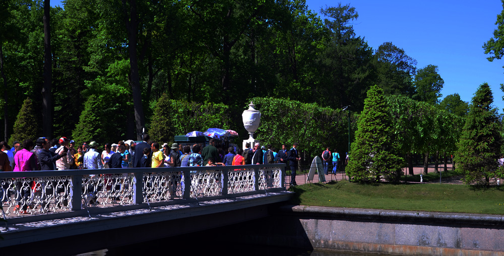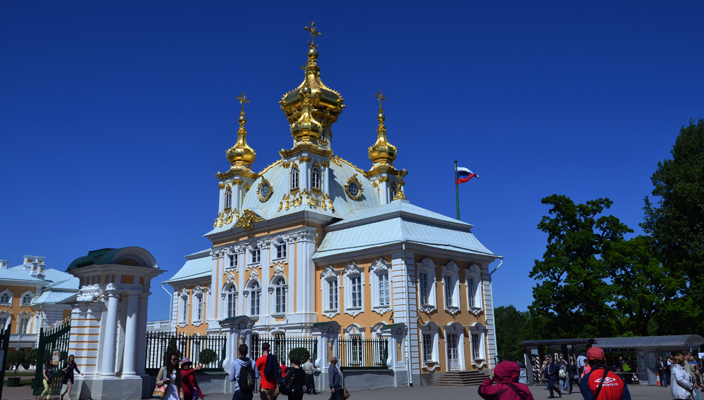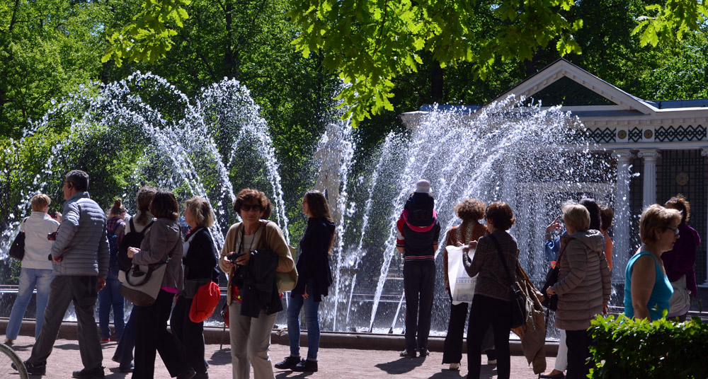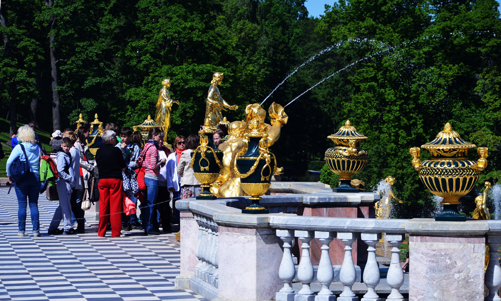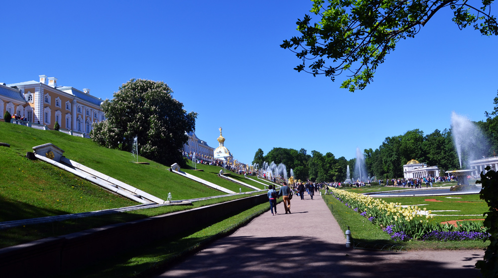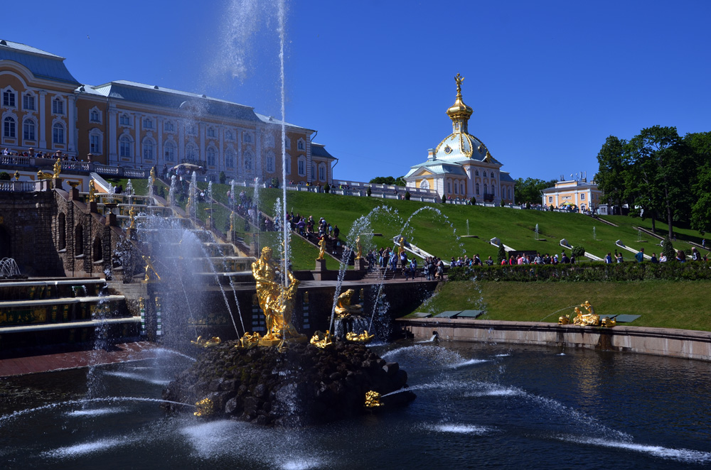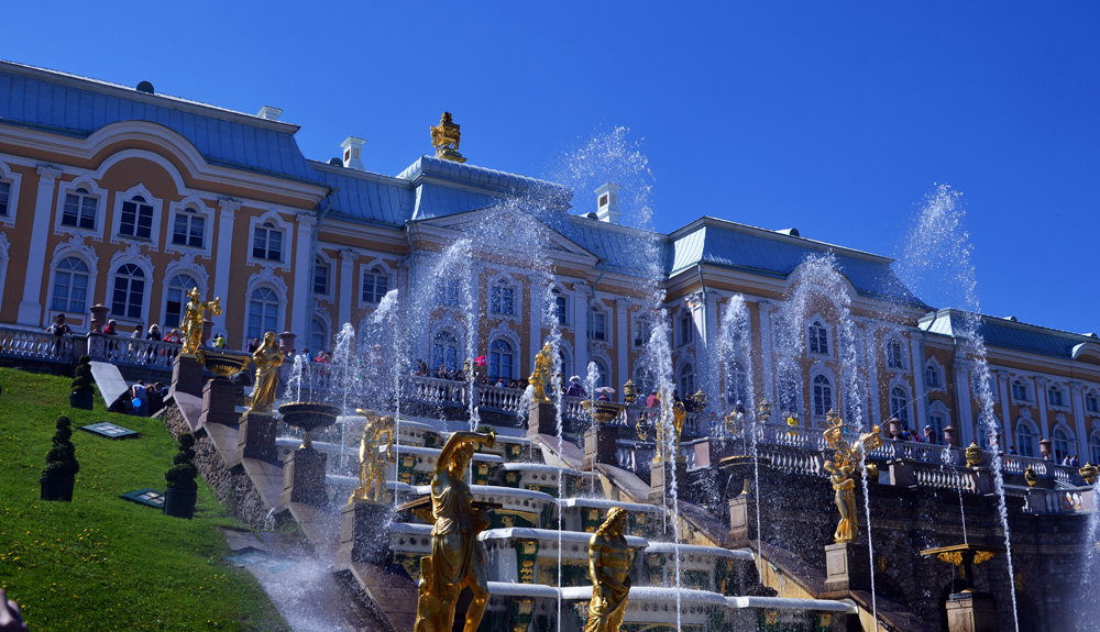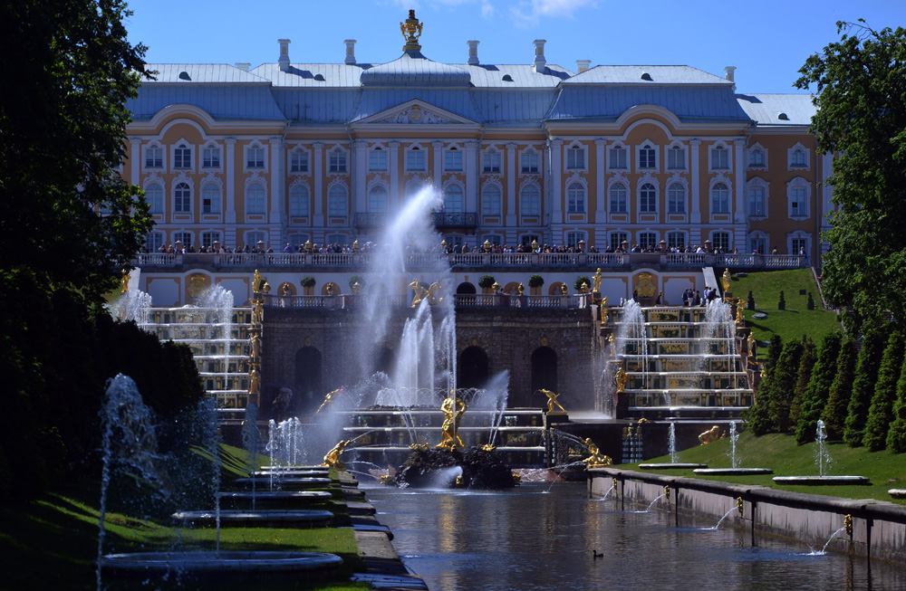 彼得堡夏宫又称为彼得宫,曾经是彼得大帝的避暑行宫(宫内禁止拍照)。它位于芬兰湾南岸,涅瓦河左岸,距彼得堡市约30公里,彼得宫分为三个部分,下花园,宫殿(大瀑布),上花园。下园有开阔的草坪,花园,喷泉与镀金雕像,是夏宫花园的最大特色。由于豪华壮丽,夏宫被人们誉为“俄罗斯的凡尔赛”。大瀑布位于大宫殿前面,是一由140座喷泉组成的喷泉群,37个金色雕像,29座浅浮雕,150个小雕像,64个喷泉及两座梯形瀑布。最著名的隆姆松喷泉,在其大半圆形水池的中央有大力士参孙和狮子搏斗的雕像。喷泉水渠直通芬兰湾。风景特别秀丽,众多喷泉穿插其间,游人都喜欢在此拍照留念。本集主要是宫殿,大瀑布及下花园。