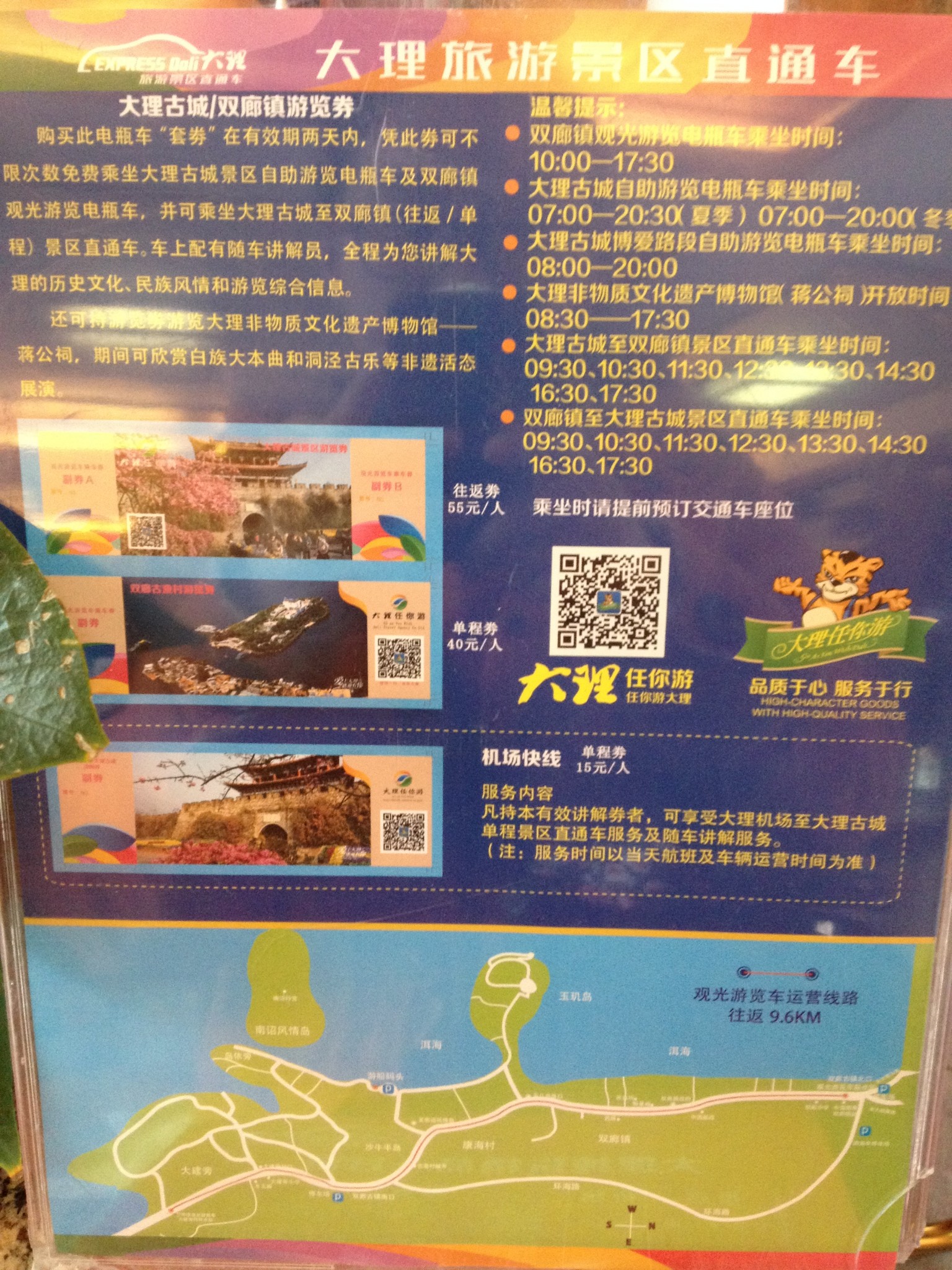 注意注意:现在从机场到大理古城有机场大巴能坐,价格和拼车的价是一样的,30元/人,另外在古城有景区直通车,包含两天内的景区无数次观光电瓶车和往返双廊汽车票等,售价55元/张,个人觉得还不错,省去前去车站坐车的麻烦。