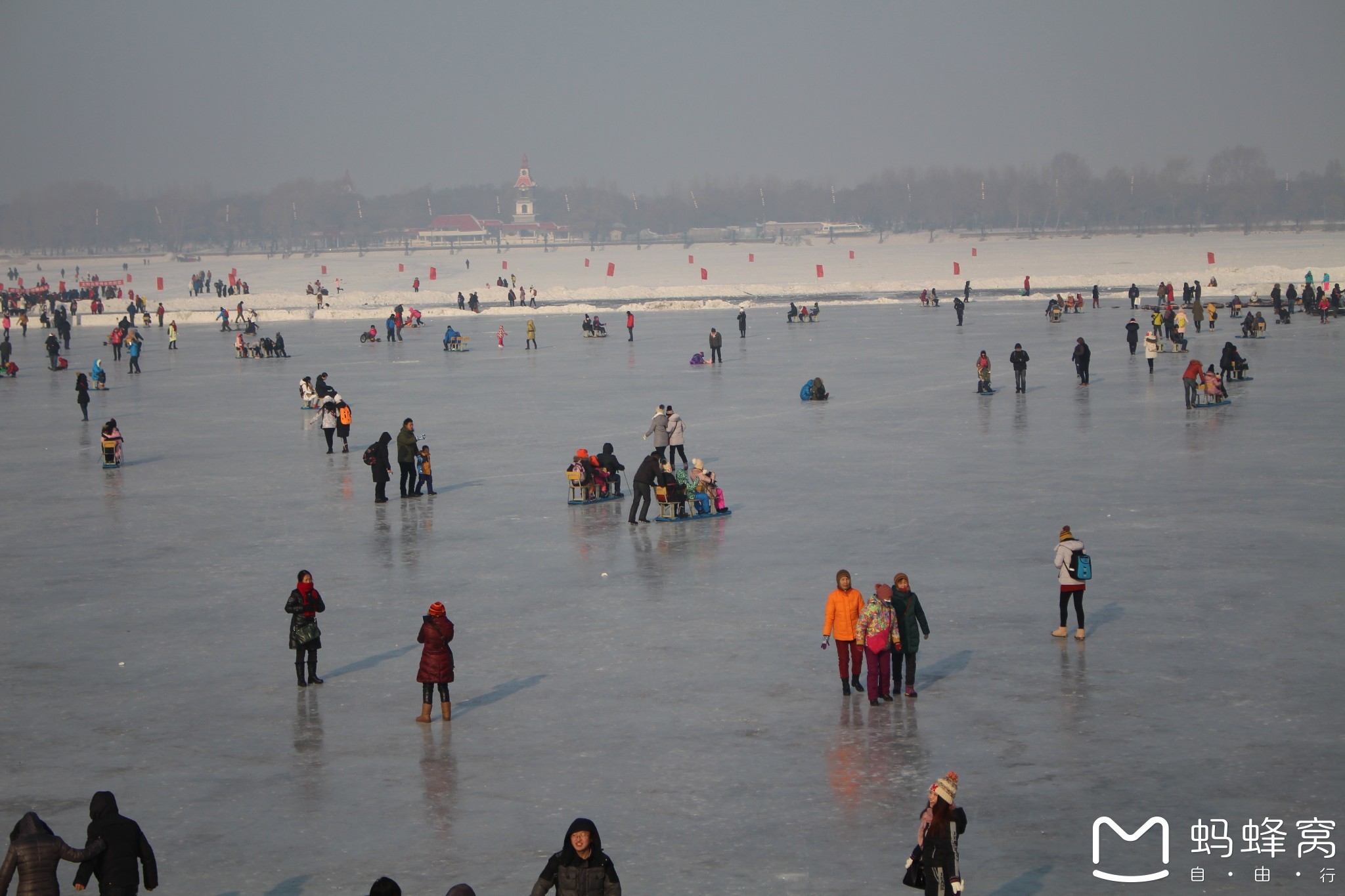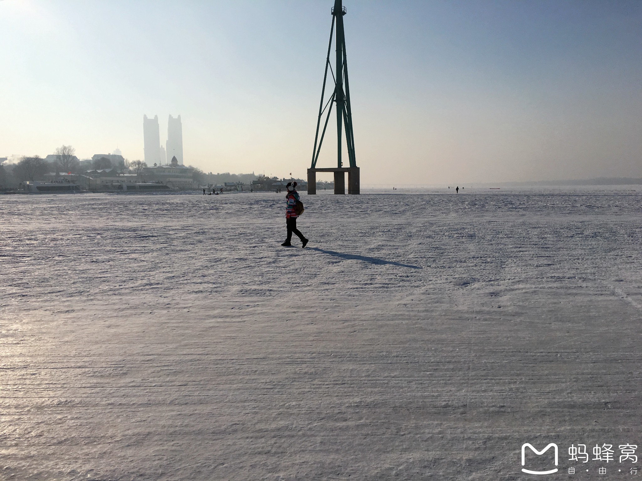 防洪纪念塔也是哈市的地标之一,以及熙熙攘攘的松花江冰面