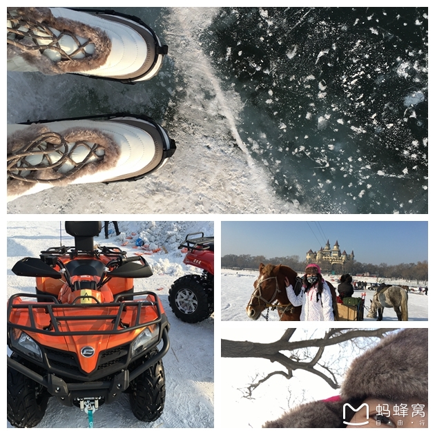 松花江上的娱乐项目相当丰富啊,除了游客,本地的居民也会来这里小耍。冰面上很滑,第一天就买了一副冰爪,实用度超高啊,不要离开松花江就扔掉,在冰雪大世界和雪乡都能用的到哦。