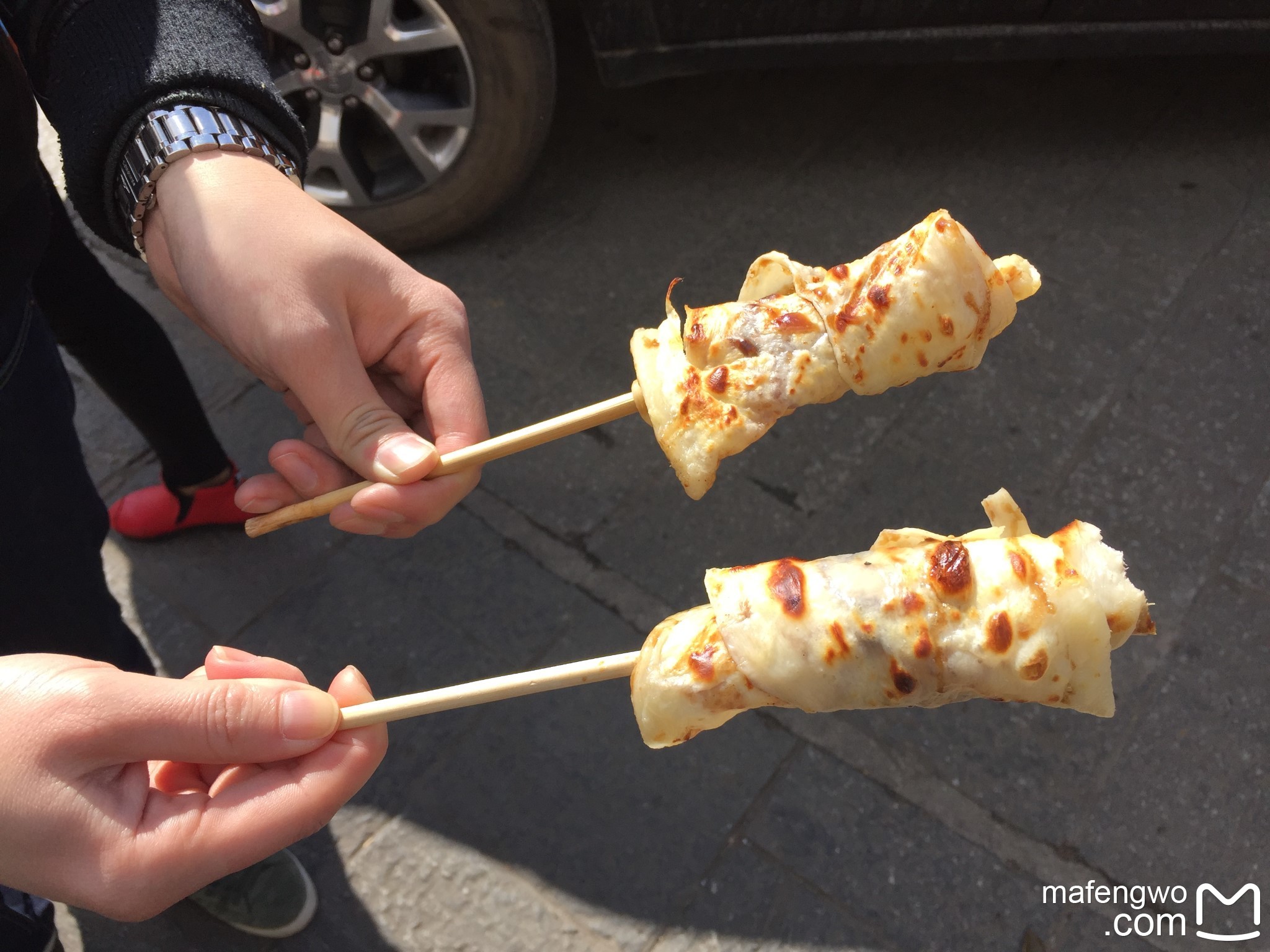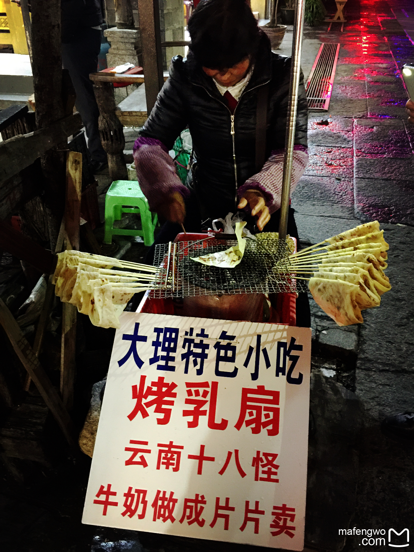 很大个的烤乳扇卷。乳扇本身是用牛奶做成的,可以生吃、油炸和烤着吃,油炸的通常都会在里面放入红豆沙馅,烤的就是在炭火小炉上加热,等它变软后刷上酱,再慢慢卷起来,虽然也出了巧克力、草莓、炼乳等等其他的口味,但还是刷玫瑰糖的酱才是最正宗的。