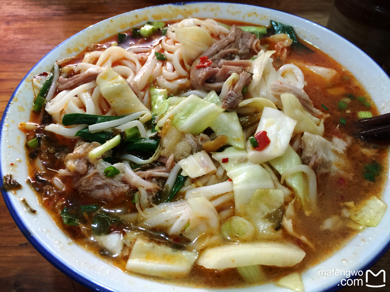 古城北门口的正宗巍山粑肉饵丝,大碗也才9元一份,老板随意揪一把饵丝扔热水里烫30秒盛出,加上经过长时间炖煮的粑肉(云南话,用料是猪肘子和五花肉,炖得很烂)和肉酱就给顾客了,旁边的一张桌子上放着韭菜、酸腌菜、泡菜、豆芽和各种油盐酱醋的调料,这些都按每个人的口味自己放,吃得不能再满足了!