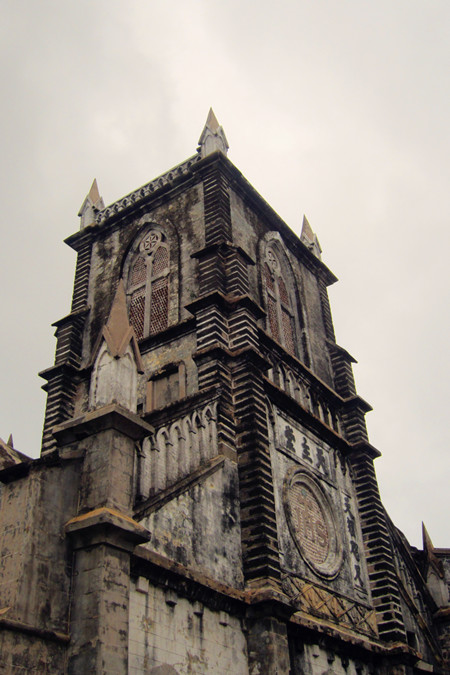 盛塘天主教堂,应该是涠洲岛最负盛名的人文建筑了。清同治年间建成,据说当时是全国四大天主教堂之一。而现在混杂在周围的摊档中,看起来只是一处并不起眼的古建筑,只有那高高的直刺云天的尖顶,昭告了它确定无疑的身份。