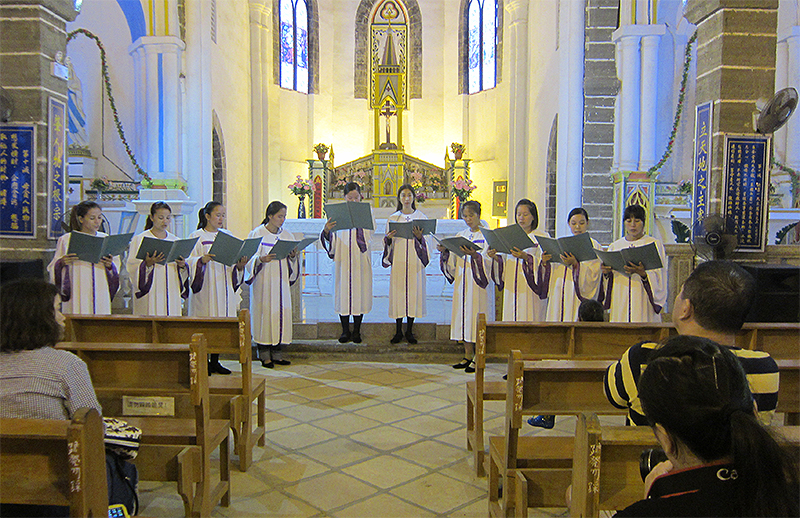 一群身穿白色长袍的唱诗班成员从教堂侧门鱼贯而入,清一色的女性。年纪看起来参差不齐,有年轻女孩也有中年女人。除了长袍,她们的发型和长袍下露出的鞋子也不尽一致,我开始感觉应该不全是神职人员或信徒,也许当中有热心的社会人士客串。