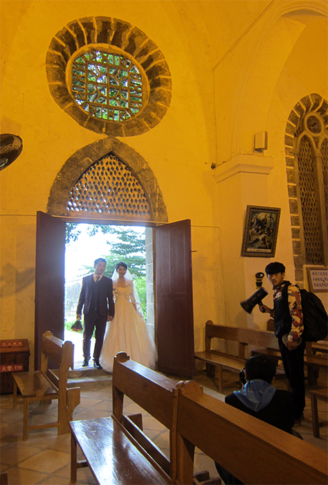 赞美诗唱完了,教堂外的雨却越发下得大了。孩子听赞美诗时挺安静,这时又吵着要回去了。我正为拉不住她而一筹莫展,忽然看见一对新人进入了教堂。显然是来拍婚纱照的,摄影师和助手忙前忙后地张罗。那真是一对身材高挑的俊男美女,尤其是女生,长相甜美,身段玲珑,让我忍不住看了又看。俩人按照摄影师的要求凝神对望,眼睛里满满的都是笑意和爱意,我觉得好像在看一出现场偶像剧。