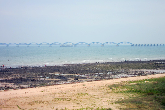 只能再好好抓紧剩下的半天时间。跟阿文又租了半天电动车,沿着昨天往贝壳沙滩去的路,一路向北。再次经过蓊密的树林和路旁珍稀鸟类的宣传硬照,碰到修路,绕到相思湖,一个名字好听但是风景一般的大水库。知道方向错了,又绕回来,兜兜转转,终于到了中石化码头。从一上岛就被吸引住的钢铁蓝桥,终于近在眼前。然而,码头上的人却说不能进去。