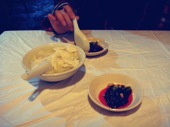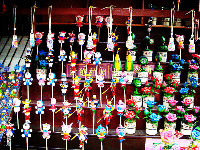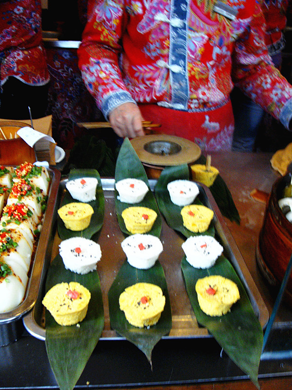好看的蒸蒸糕,白颜色的是木粉做的,黄色的是玉米做的,上面放上了黑白芝麻和蜜饯点缀,看起来很有食欲~这家的服务员不仅转着很有特色,而且他们家生意也很好,有各种各样的好看的好吃的小吃摆在游客们挑选~尽情的吃吧吃货们~