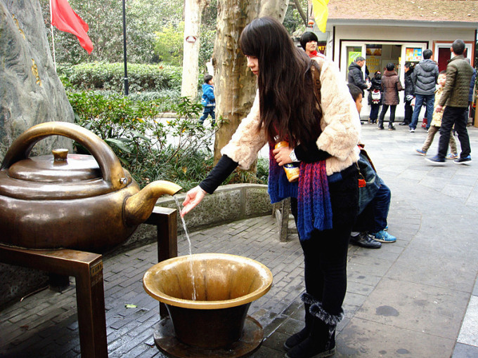 宽窄巷子和人民公园离得不远,大概差不多一站路吧,勤问问人,走过去就好了。人民公园里面许多人士来休息休息闲逛,喝喝茶,这里面的喝茶是一茶一坐···我不爱喝茶,想着妈妈买一份就好,谁知道···一茶一坐,不买茶连坐都不让坐·····下面的这个是人民公园里面供人们洗手的一个水龙头,看起来很好玩儿就去试了试~