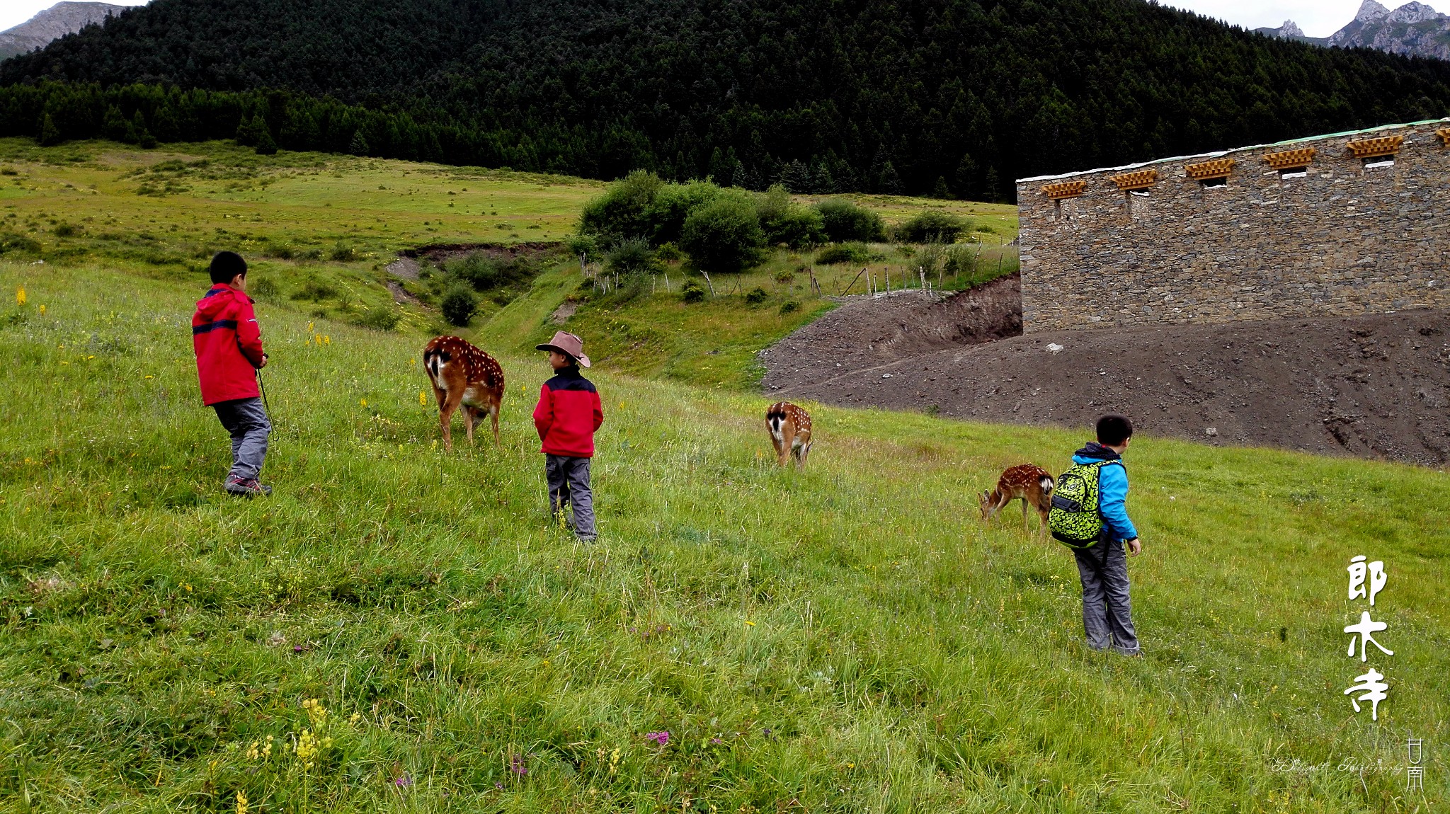 在寺院里我们偶遇三只野生梅花鹿,孩子们也得以来了个近距离接触
