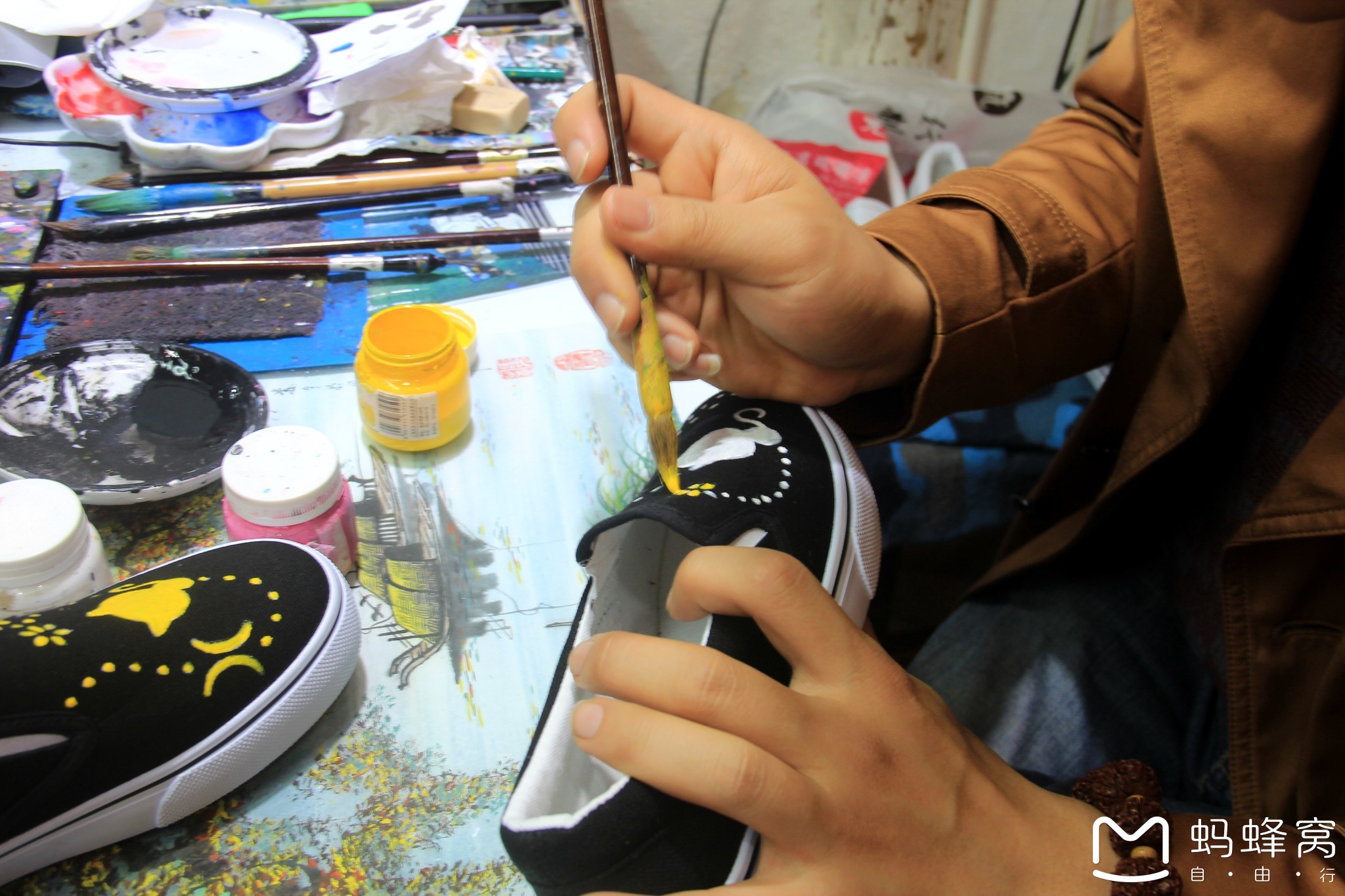 在小巷的一处,我们还找到了一家手绘鞋作坊。这里不仅出售成品手绘鞋,还可以根据你的喜好定制,选好了图案,立等可取。手绘鞋创意无限,充满了乐趣。