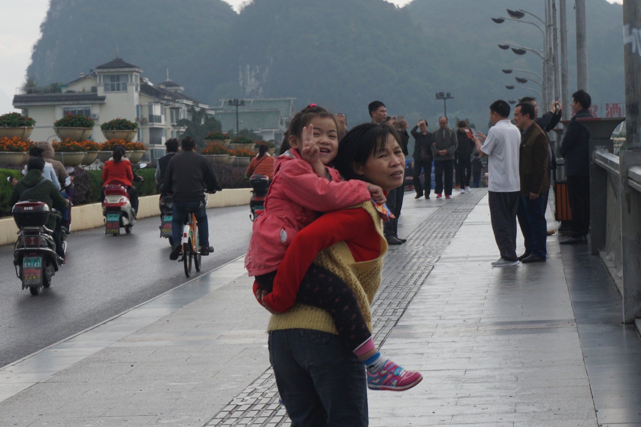 妈妈背上的小女孩,看我拿着相机到处拍,一直在回头看我,是觉得我奇怪呢,还是想让我拍她呢?于是我就拿起相机,对准那小女孩,小女孩很配合的竖起两个手指。