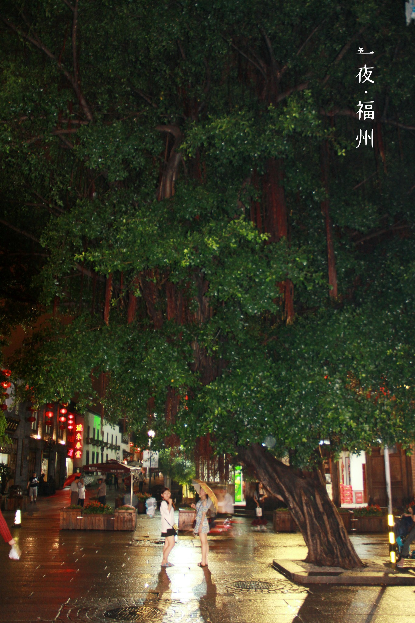 忽的抬头一看,是一颗老榕树,在雨水的冲刷及灯光的照射下树叶煜煜发光,树干上刻着历史的沧桑,它站在这里已有多久,又看到了多少的变迁,才长成了这雄伟而慈祥的模样呢。