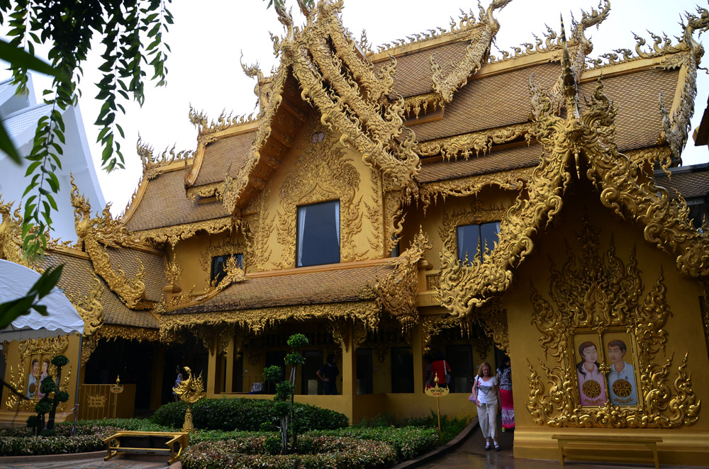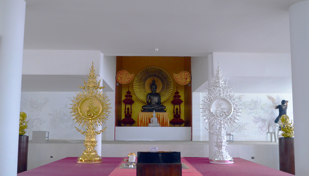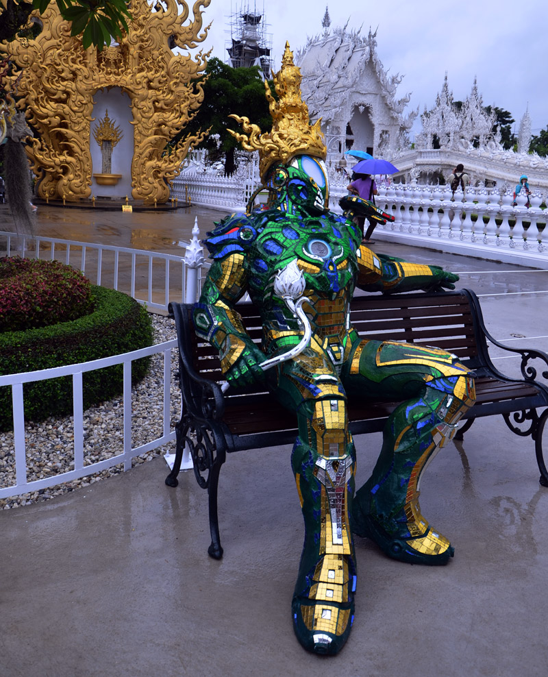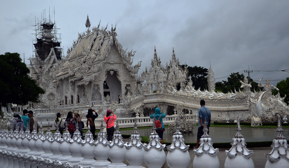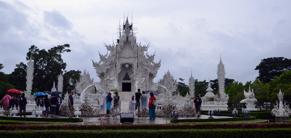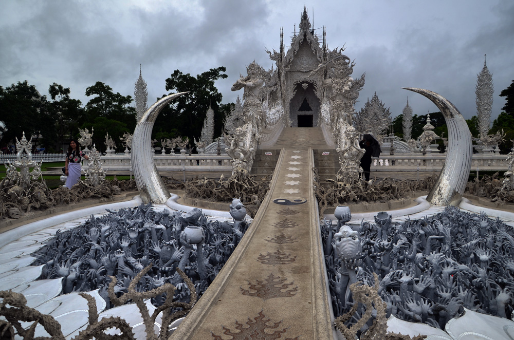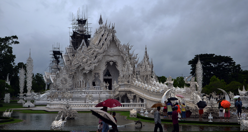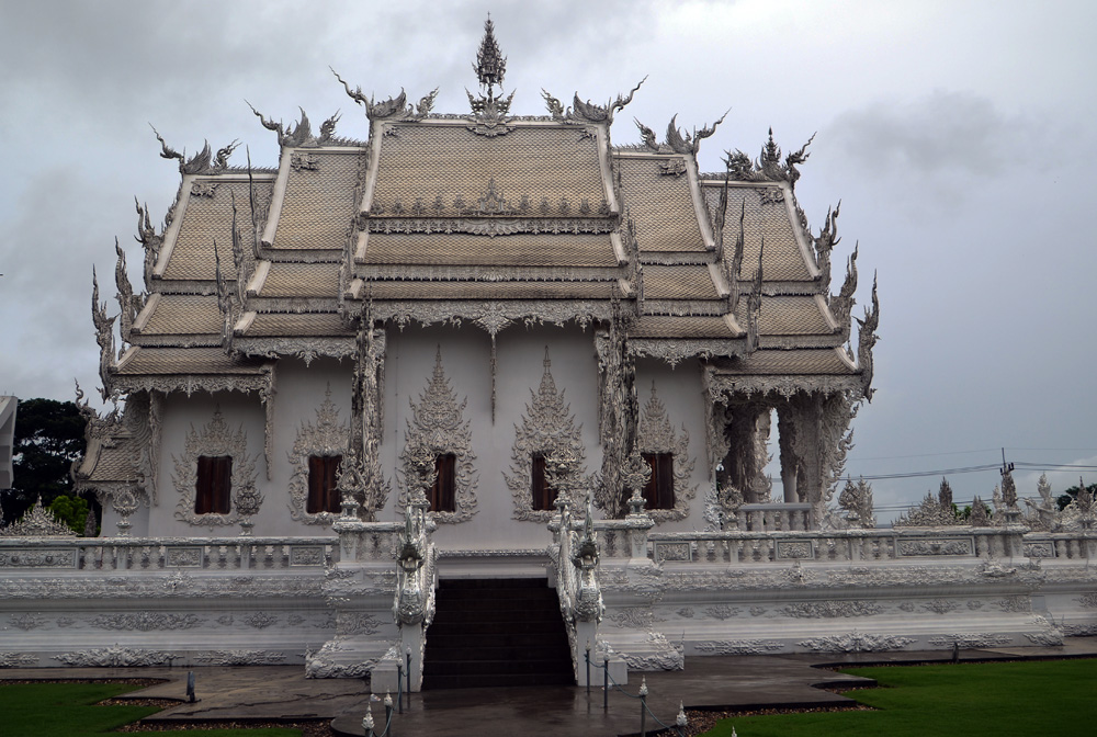 距离泰国中心城市清迈180公里,曼谷900公里左右的泰北清莱白庙(即灵光寺)建于1998年,由泰国著名建筑师(原为画家)Chalermchai Kositpipat设计建造,建庙资金来自他二十年来的积蓄,以及有心人的捐献,他在建造中间曾经几次修改图纸,工程做的特别慢。但也正因为他对佛祖的 忠诚 ,还有对建筑设计的执着,造就了这么一个精细,完美的寺庙。这座寺庙为什么要为白色,他说:白色代表了纯洁,闪闪发光的玻璃片是智慧的象征。不同于别处看到的寺庙,这里特色不仅仅是纯白的屋顶,纯白的墙壁,纯白的基座,还融入了很多艺术家的思想和思维,整体风格似乎有西洋建筑的影子,不仅精美杰伦,还别具匠心,即大气滂沱,又柔美似水。最主要是用建筑、用雕塑诠释了佛教的含义、佛教的精华、佛教的智慧。除了佛教,还看到了其他宗教的影子和人物,表现出佛教的包容与博大。