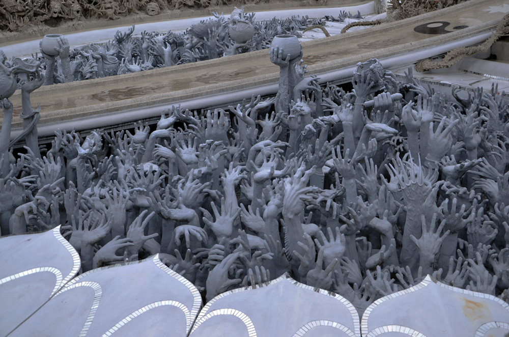 庙前千百只手臂在奈何桥下挥动,挣扎、哭喊、忏悔。。。地狱里堕落的灵魂等待被救赎。肉眼所看到的全是各种魂灵狰狞的表情与挣扎,转身再走过廓桥后,越靠近寺庙,其建筑在两旁的雕像也越来越详和。