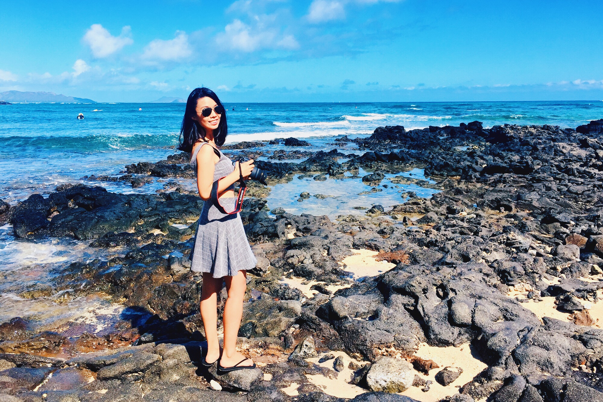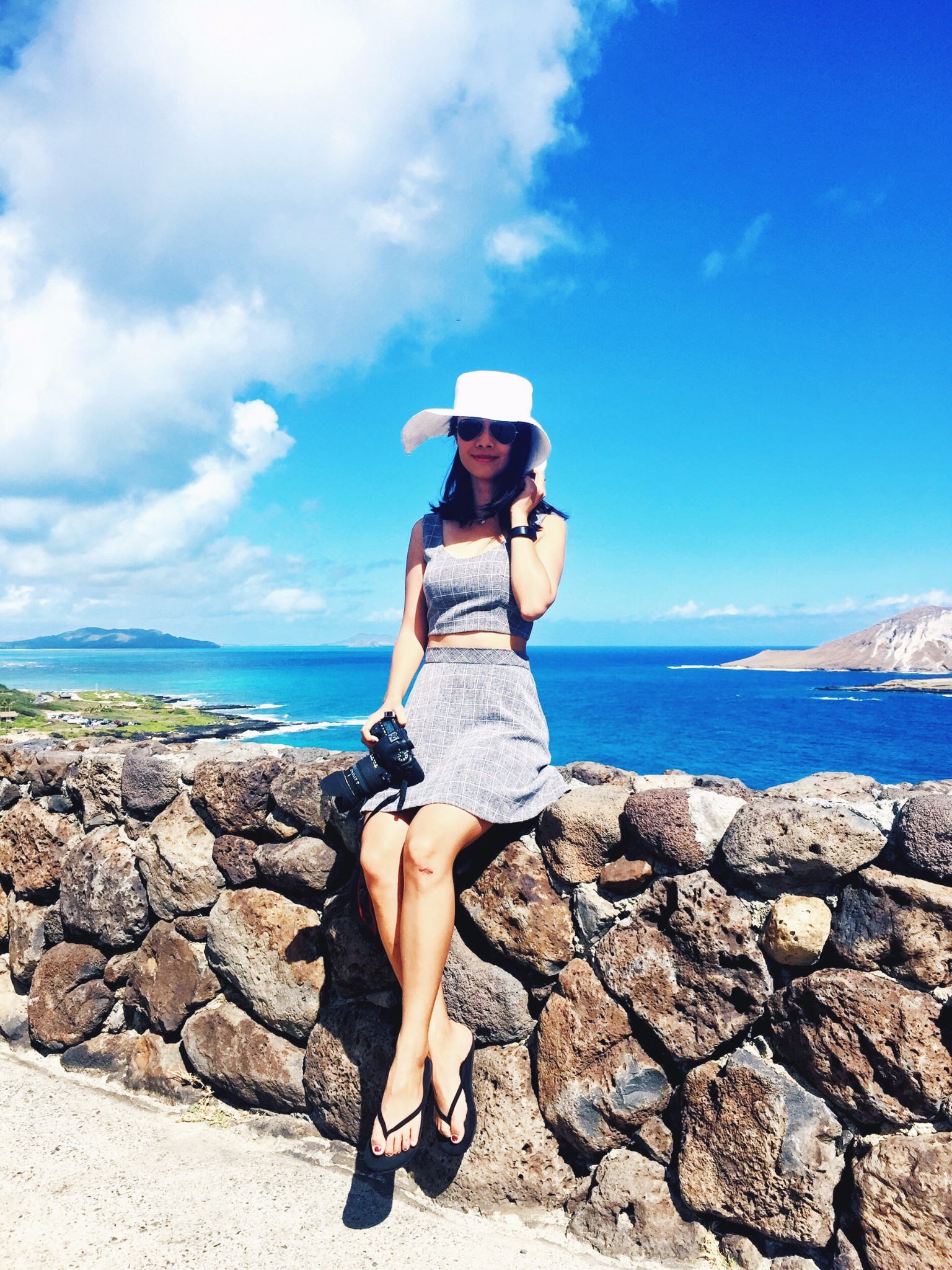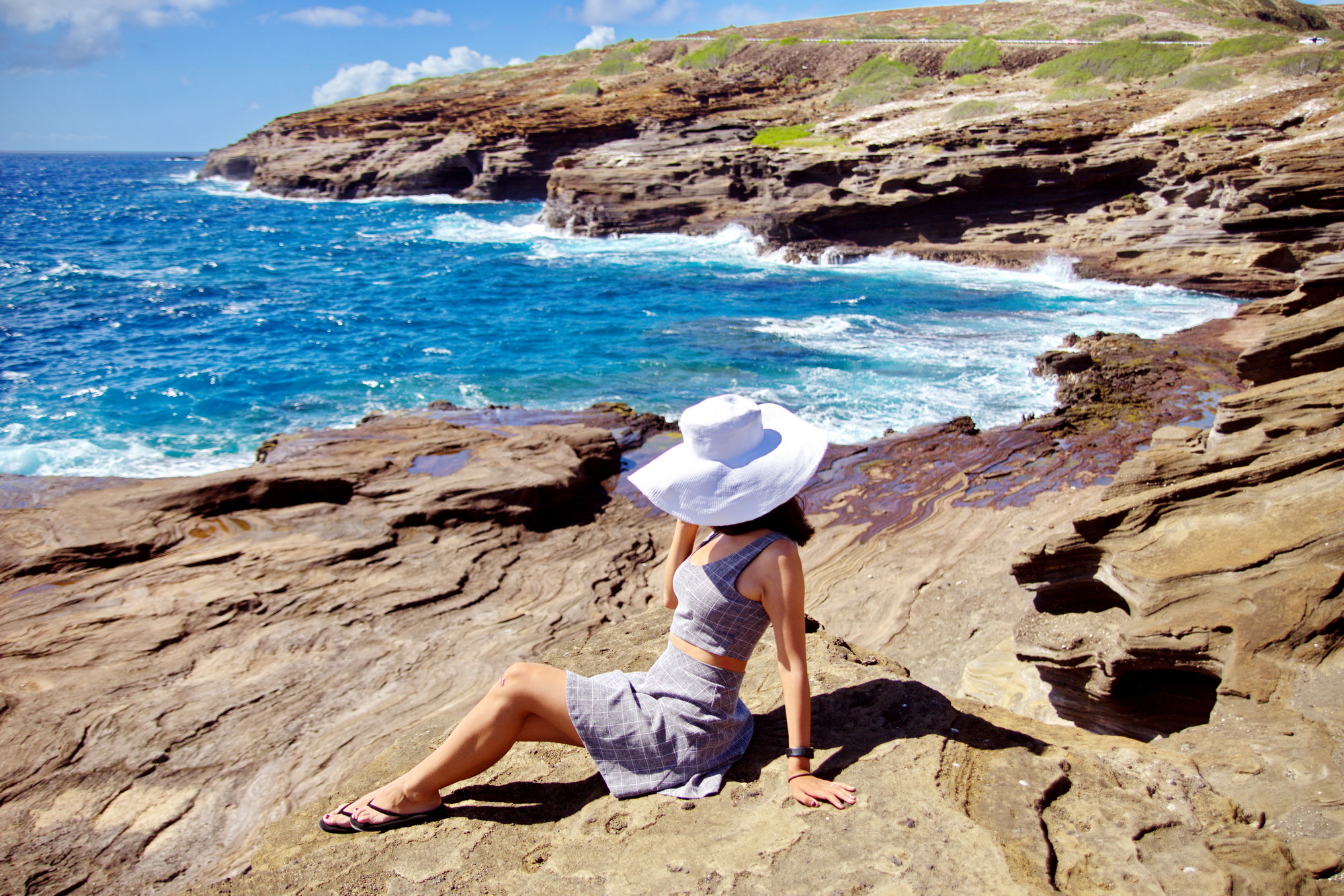 这里是瓦胡岛的最东端。岸边风大浪大,吹得我裙子都快飞起来,只好用双手捏紧了裙子。另外这里的停车依然是个问题,我们到的时候根本没有停车位,只好胆战心惊停在路边。