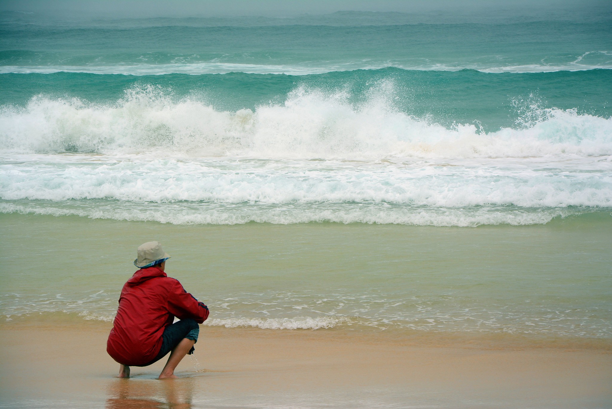 还有这位小兄弟,冒雨蹲在沙滩上,久久凝望着海浪~~