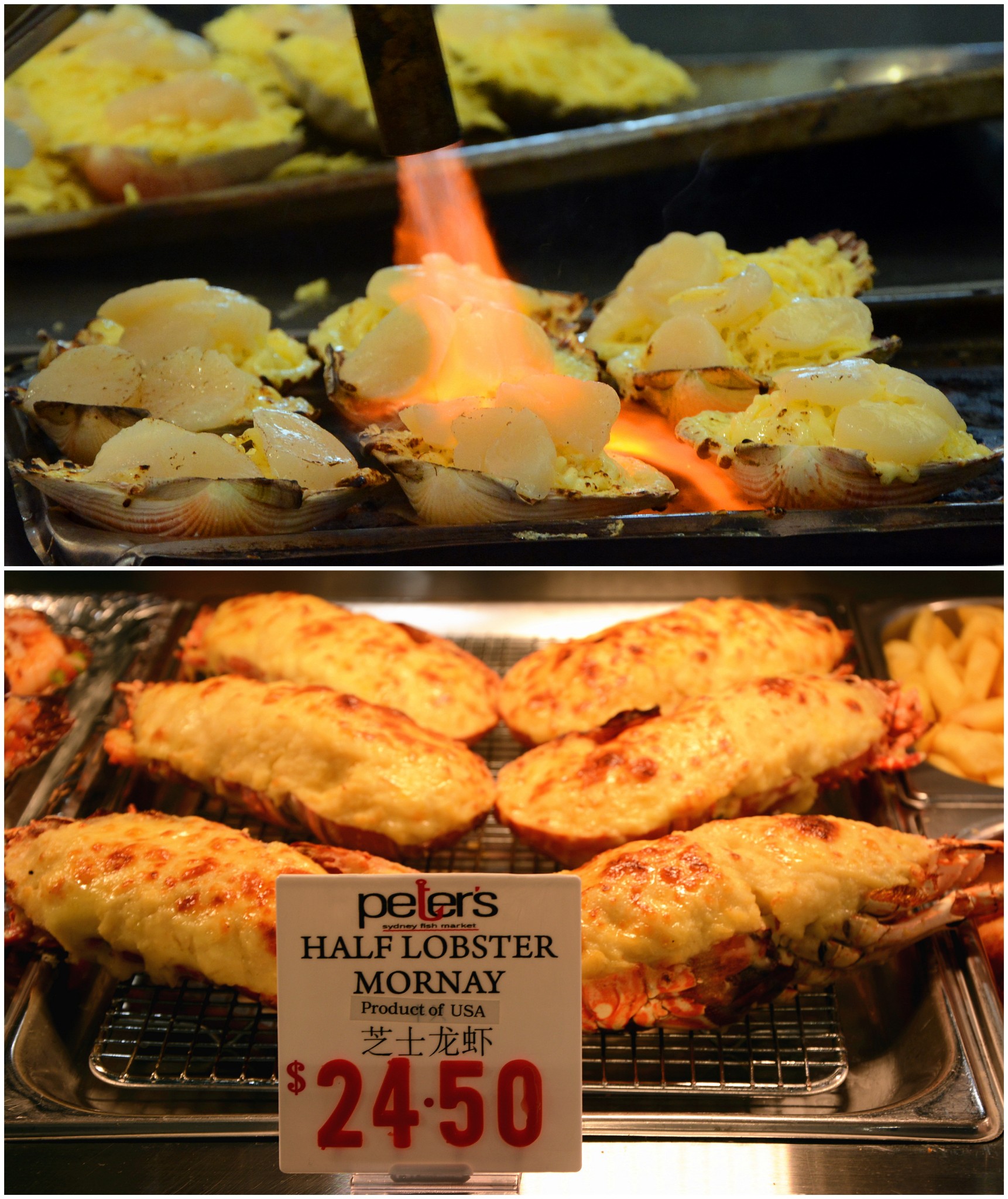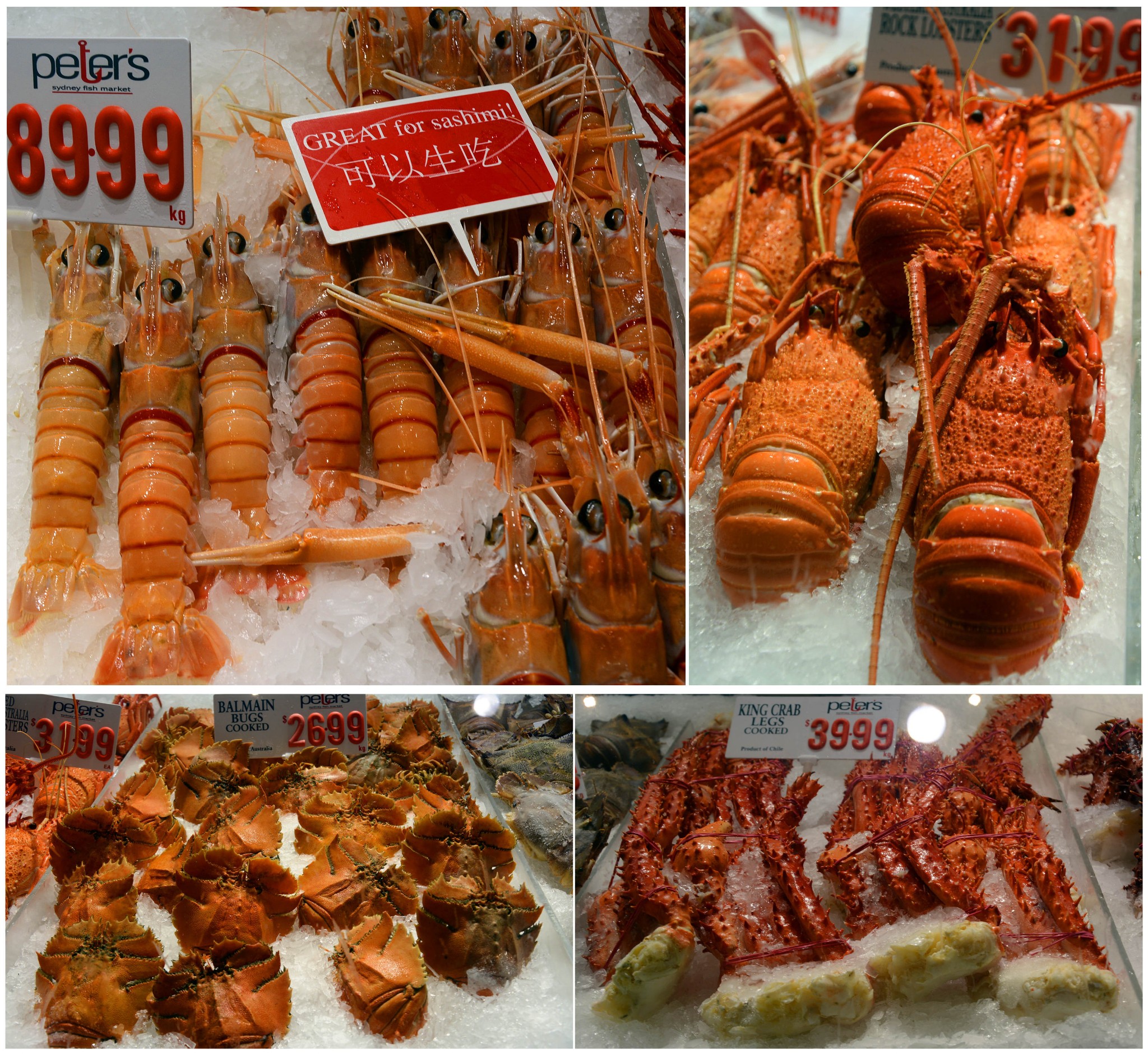 市场里主要客源集中在门口的Christie's 和 Peter's, 两家,店里熟食摊的各式海产尽现眼前,深海大龙虾,整条肥美三文鱼,巨大的皇帝蟹,闪闪发光的对虾,鲜活生蚝……琳琅满目。