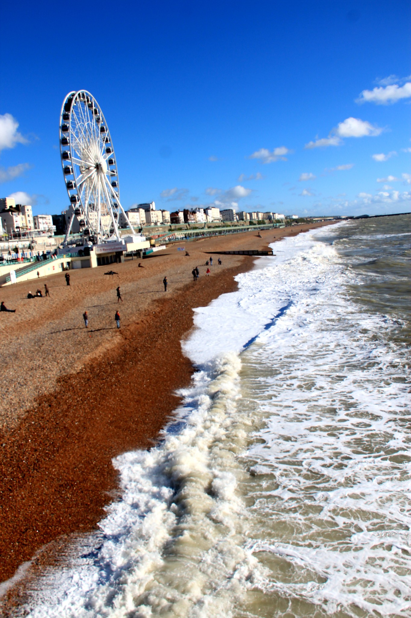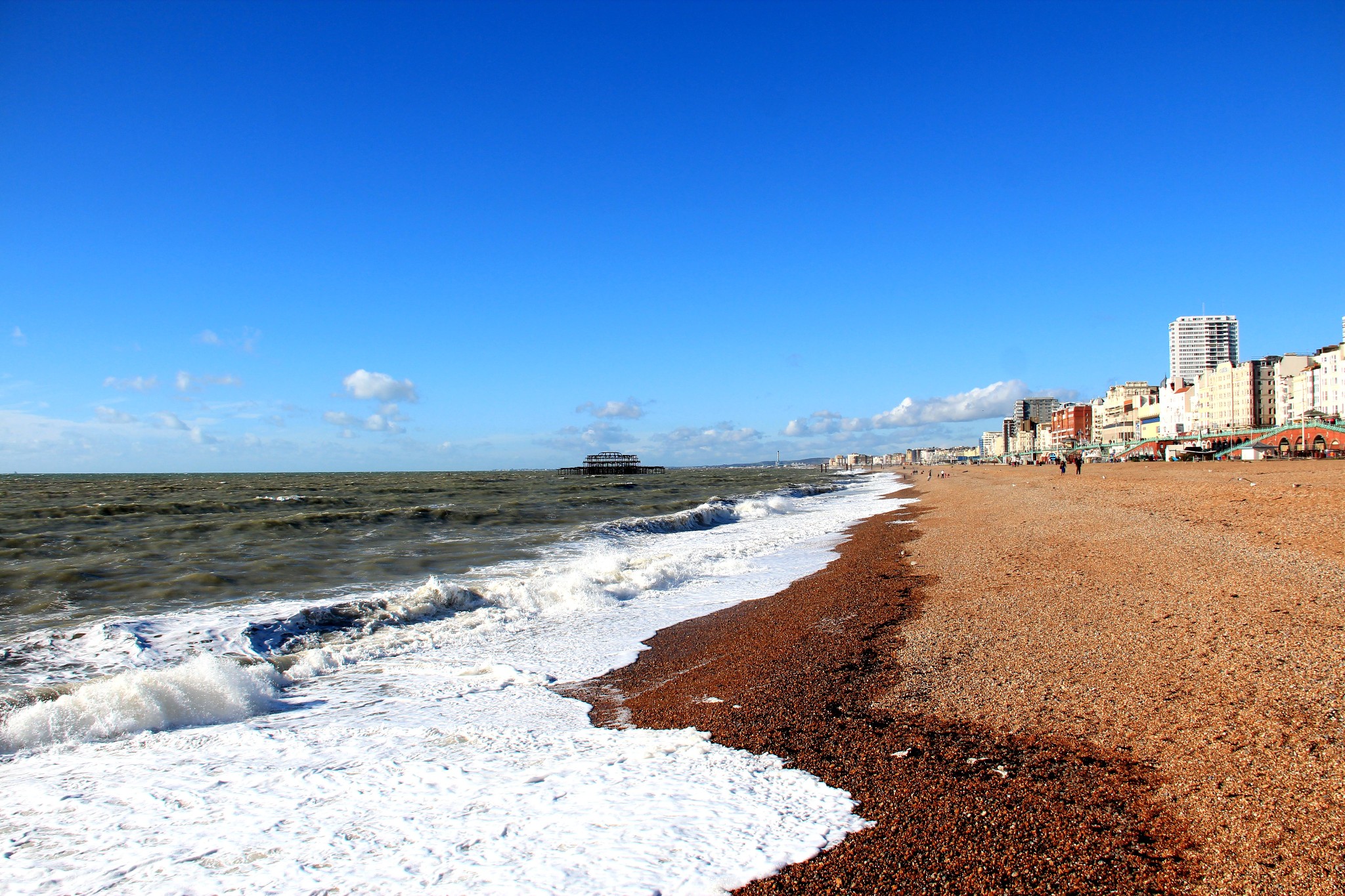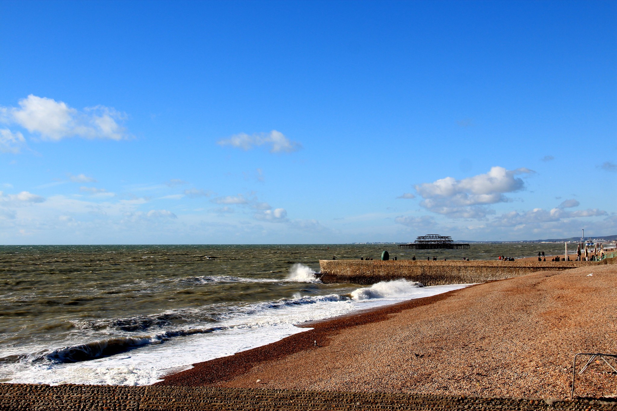 天空很蓝,飘着几朵白云,浪花一朵朵,拍打着海滩,冬天的布莱顿海滩宛如一幅风景画。