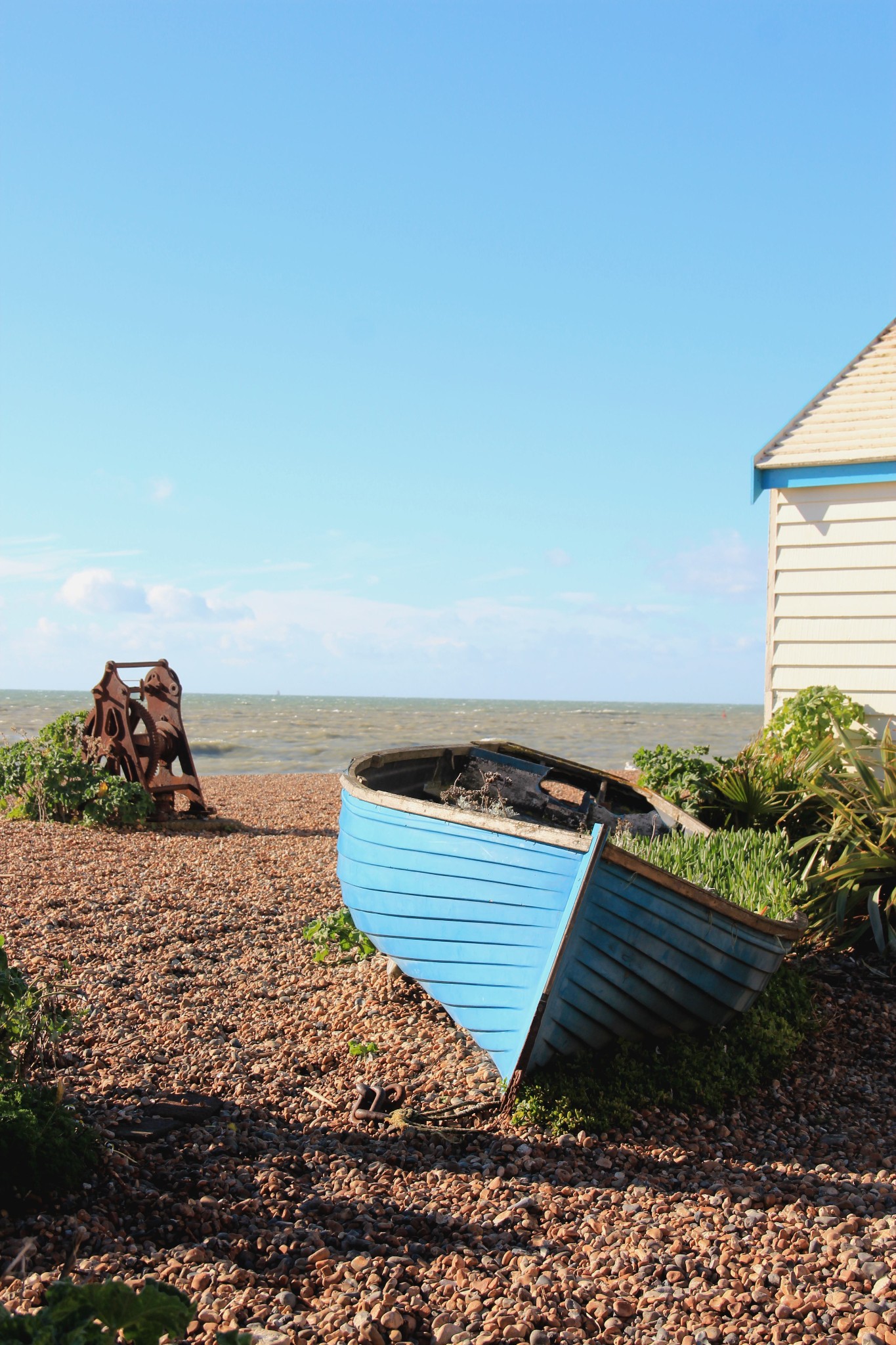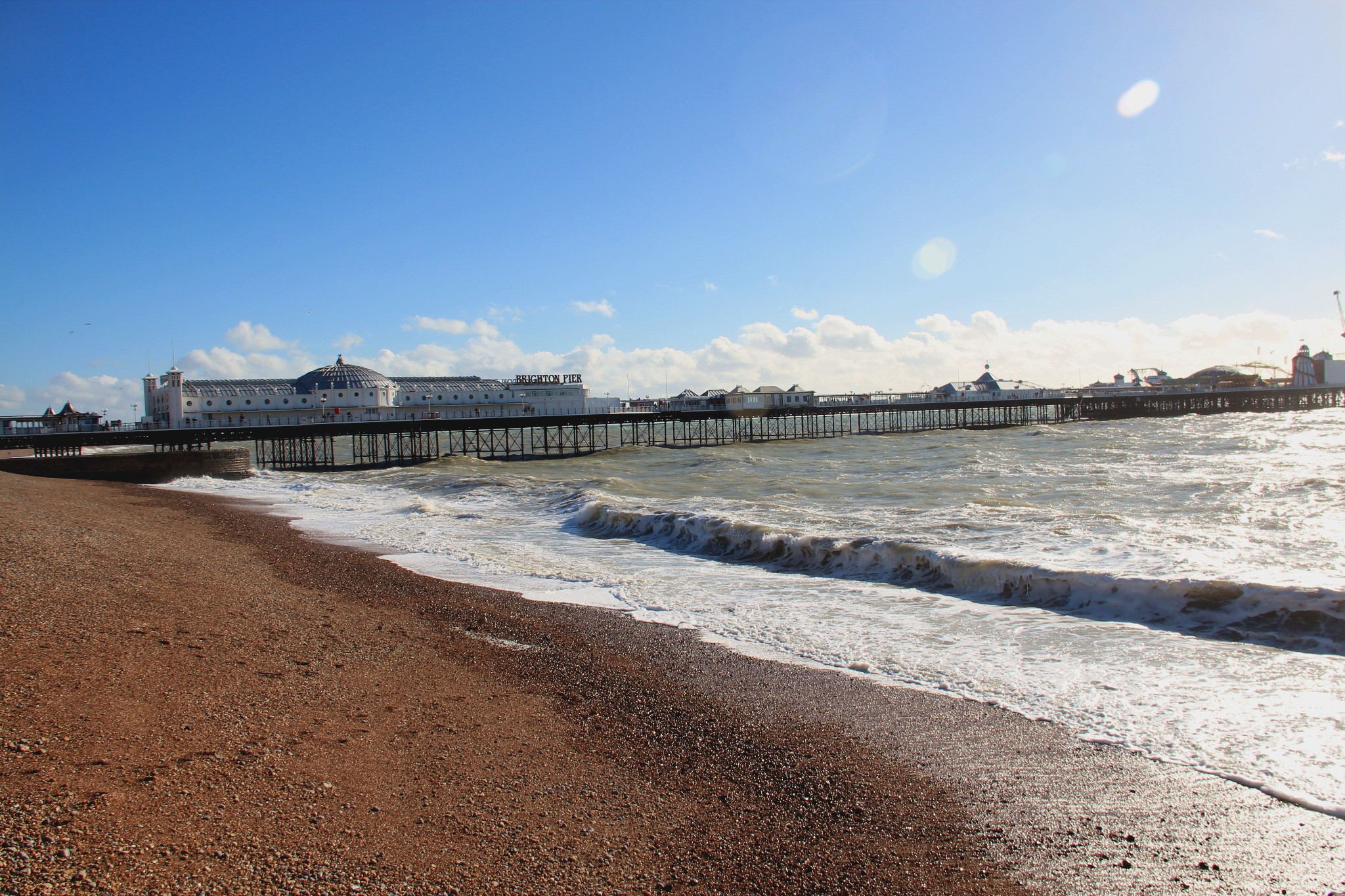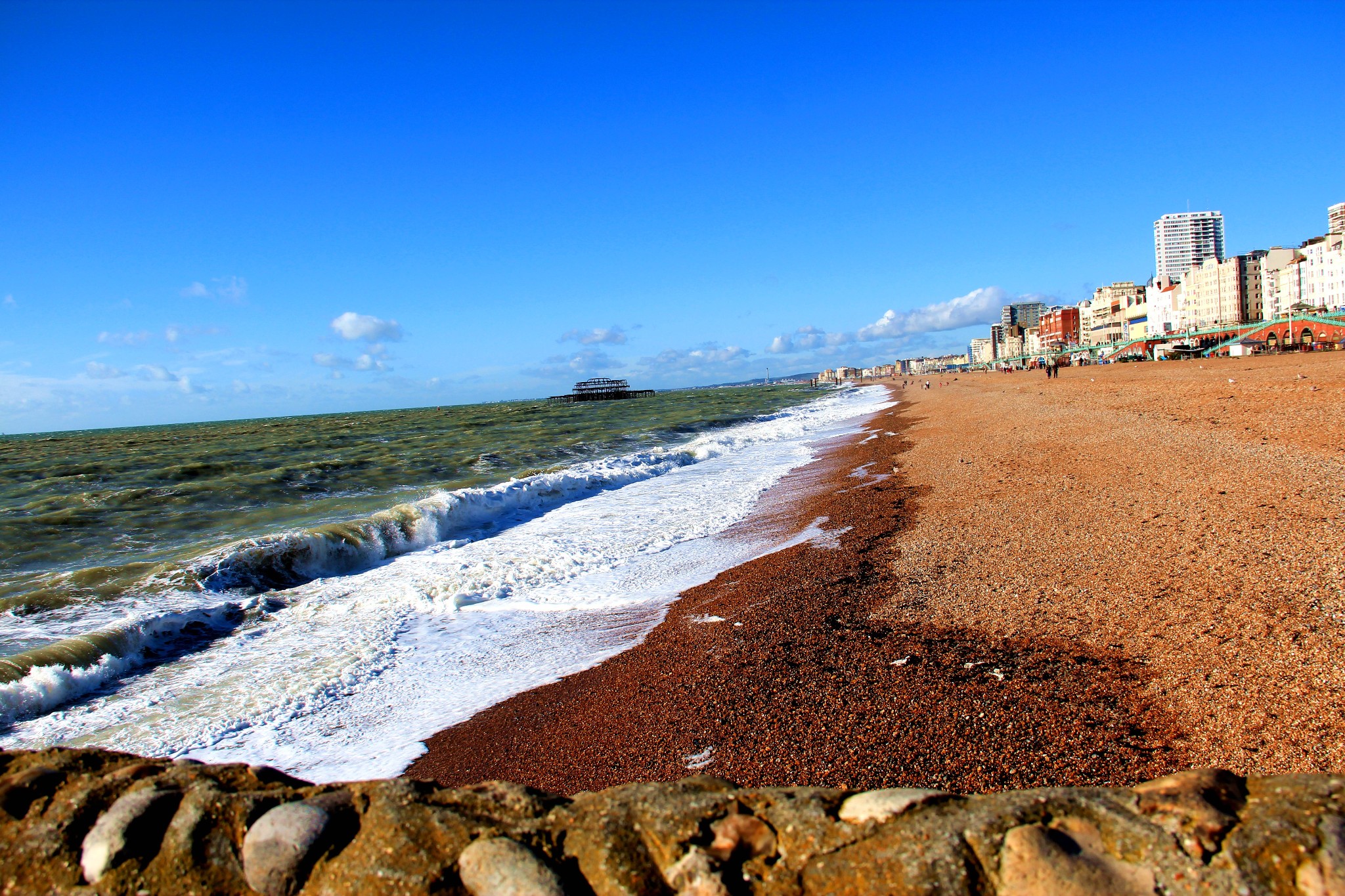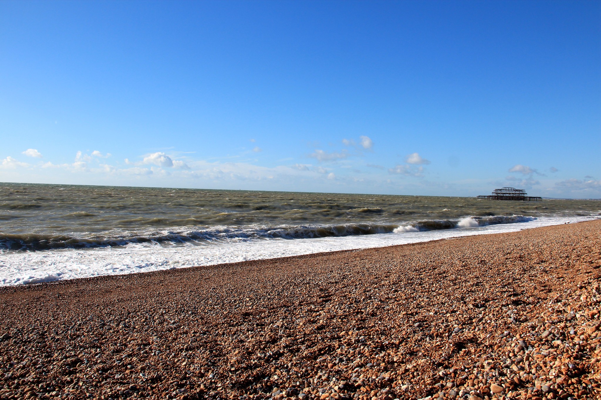 天空很蓝,飘着几朵白云,浪花一朵朵,拍打着海滩,冬天的布莱顿海滩宛如一幅风景画。