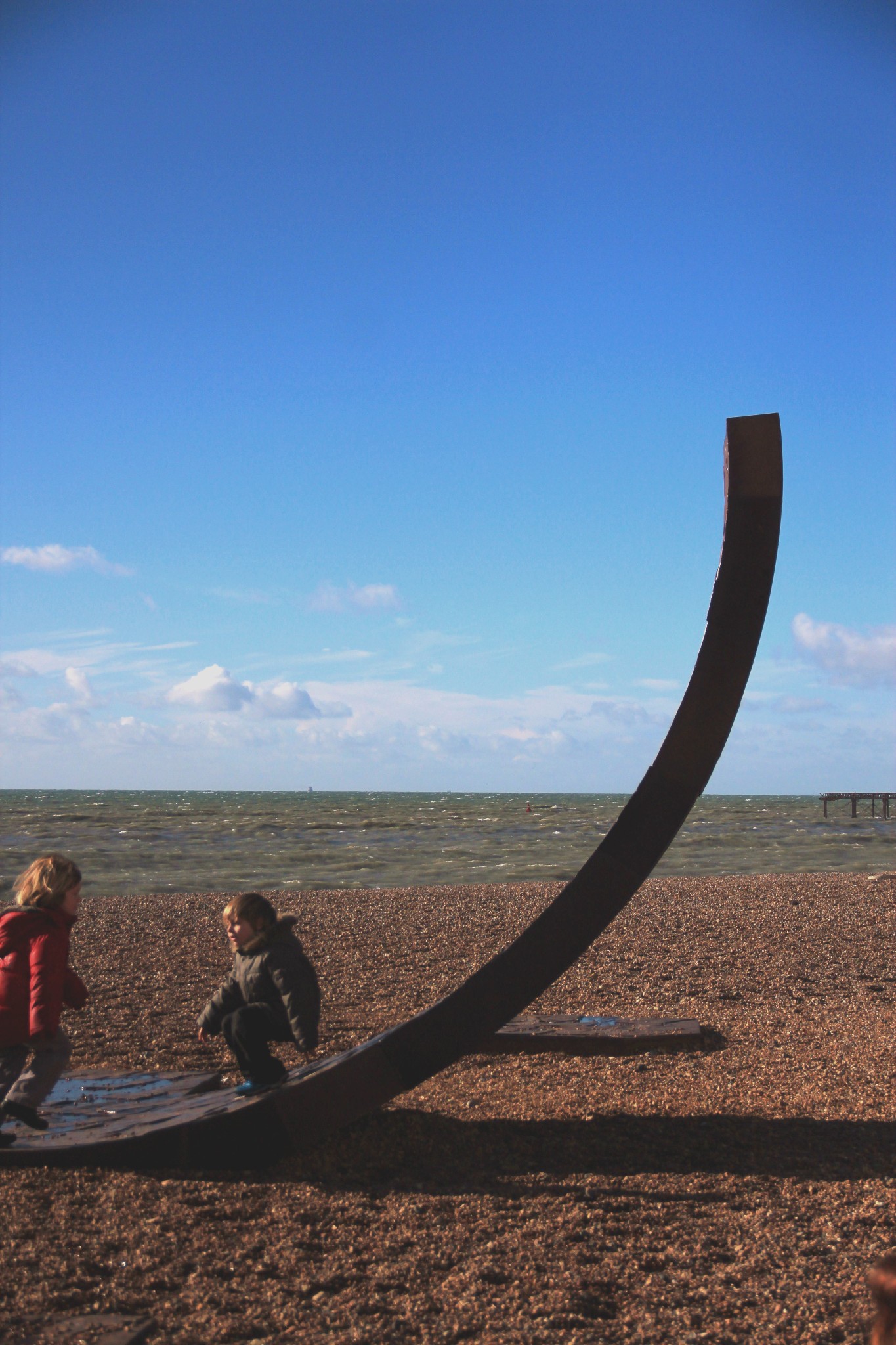 零星有几个孩子在海滩边玩耍,现代派的抽象雕塑成为了孩子们乐此不彼的游乐场。