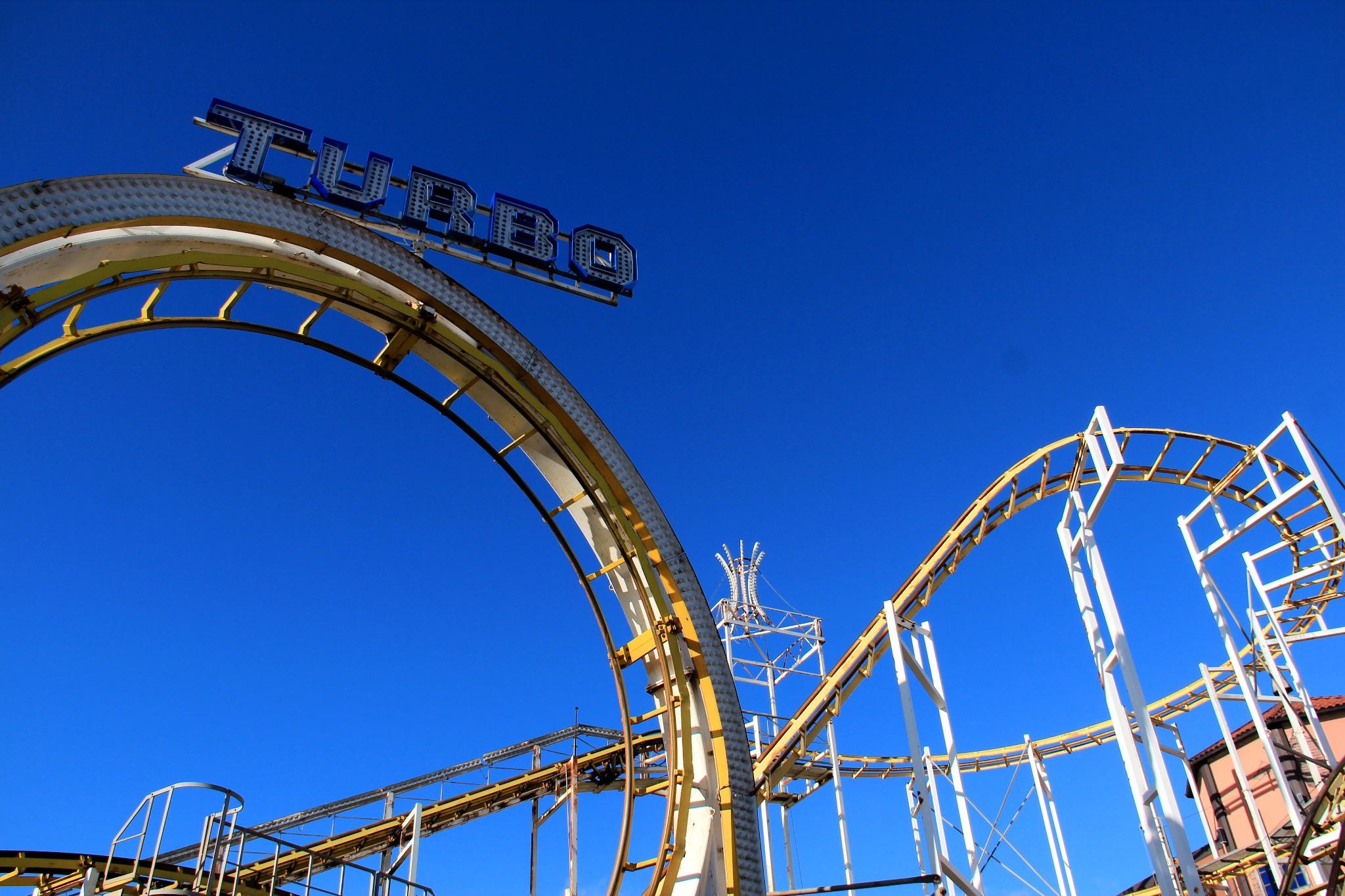 过山车自然也是游乐场的必备之物。坐在飞啸而过的过山车上,看着碧海蓝天白云,和香港海洋公园临海的过山车有的一拼。