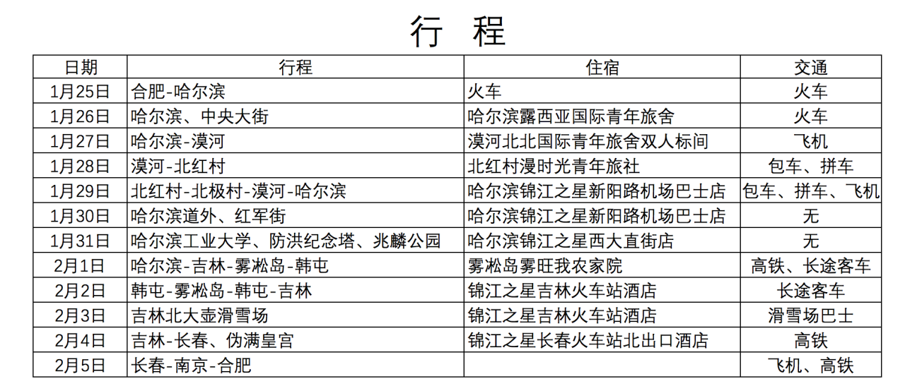 本来我是扬言要去最北的城市——齐齐哈尔,后来发现干脆直接杀到漠河最北的国境线算了。然后再加上东北的美食、美丽的雾凇和刺激的滑雪,最后再假装告诉 我要独自出发了,两个人12天的长途旅程就这样开启了。