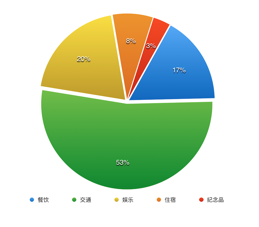 由于全程包含了3张机票,加上高铁和包车,交通所占的花费比例较大。全程2人总共花费14000元。