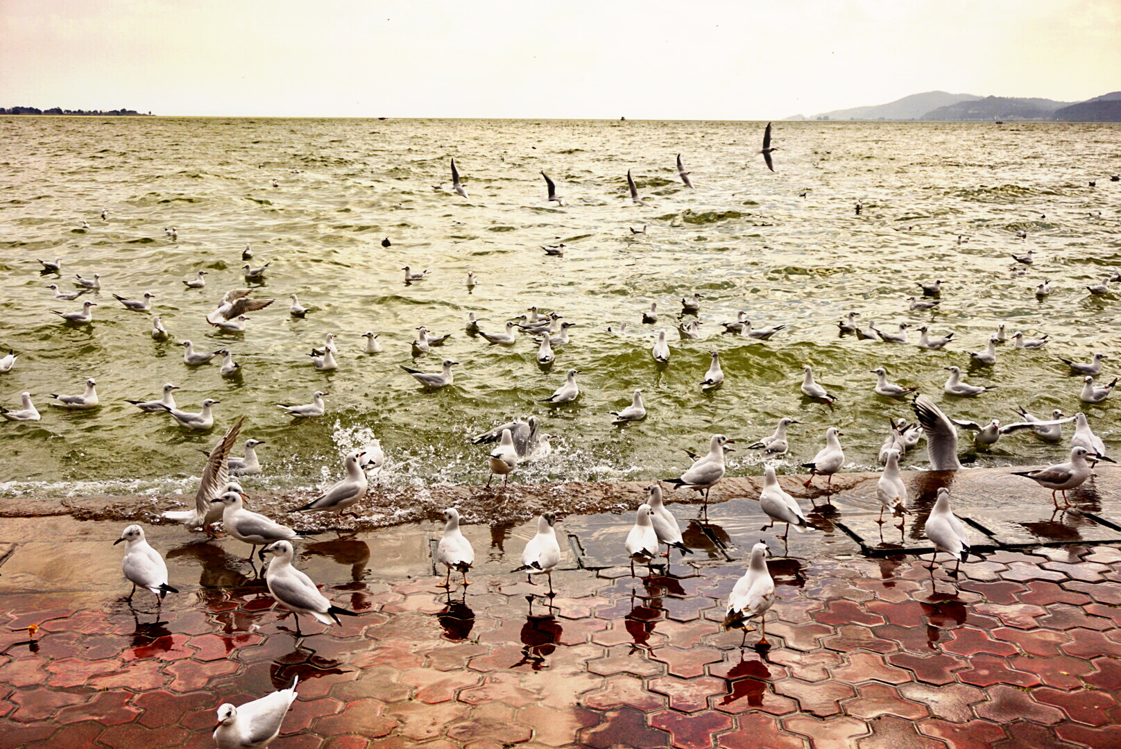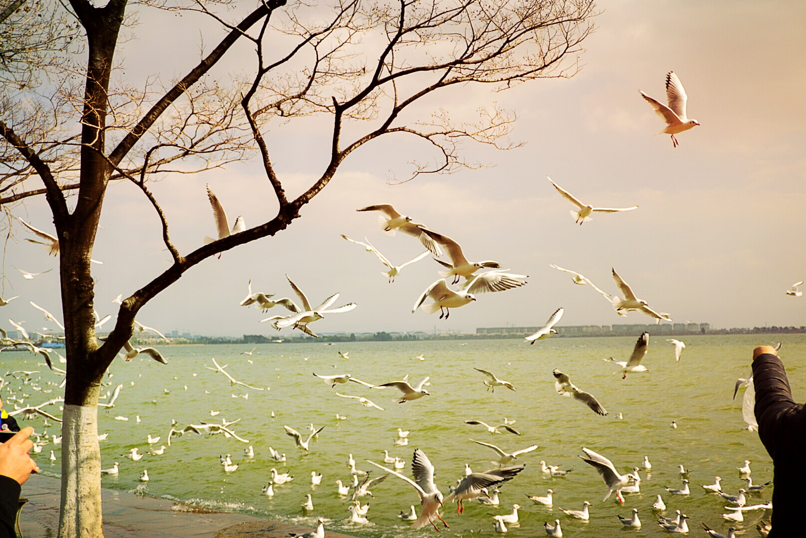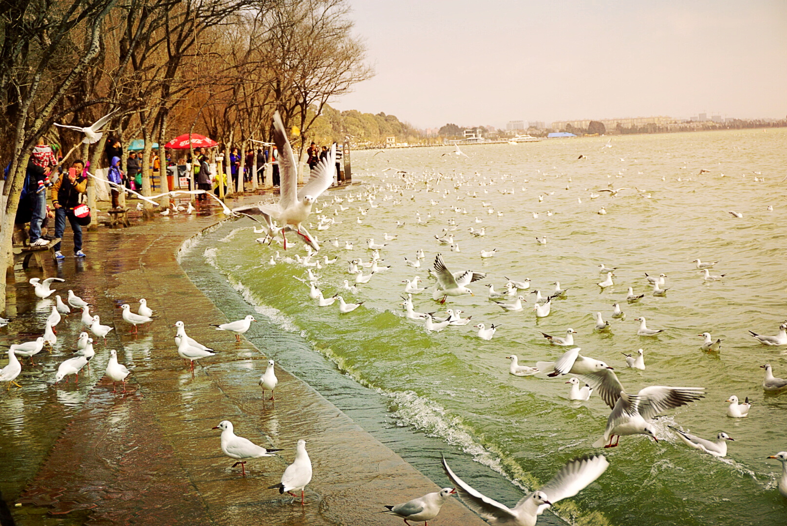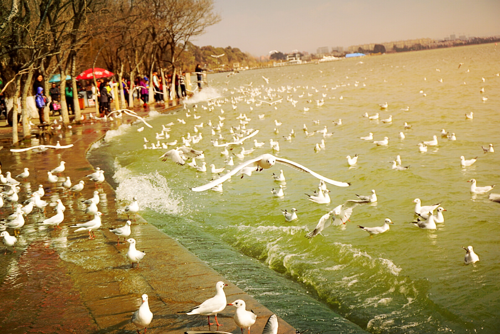 一进海梗公园,便能看到成群结队的peopel and red birds哈哈哈……好多人和红嘴鸥~不断有人给它们喂食,一把饲料扔下去,就会有一大群海鸥飞过来,太壮观啦~一阵狂拍~