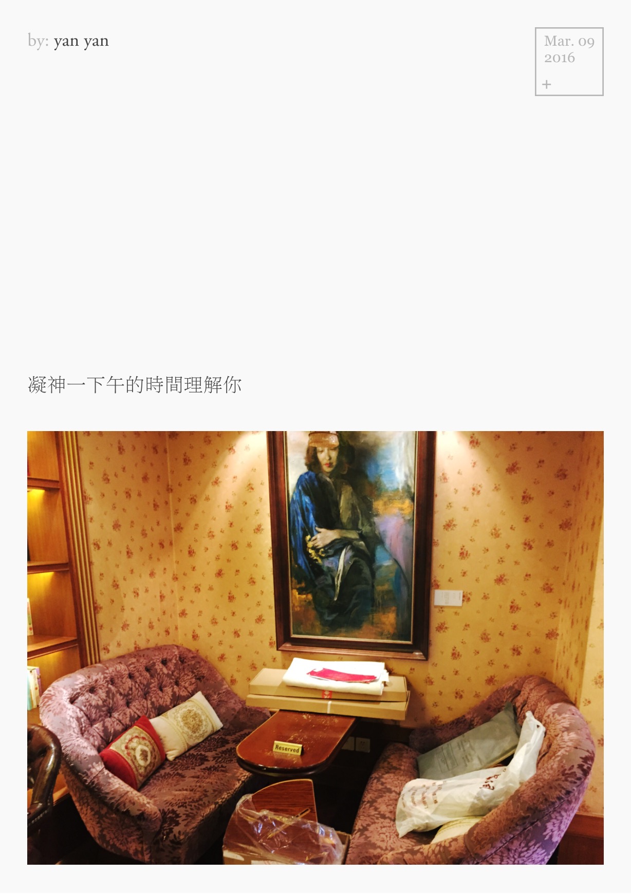 整个咖啡馆放的音乐啊或者是布局啊都有一种张爱玲偏爱的小资情调,不深沉,不轻佻却有种她的韵味在其中。