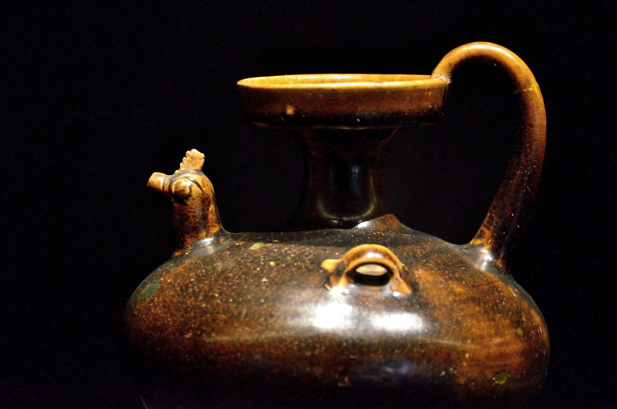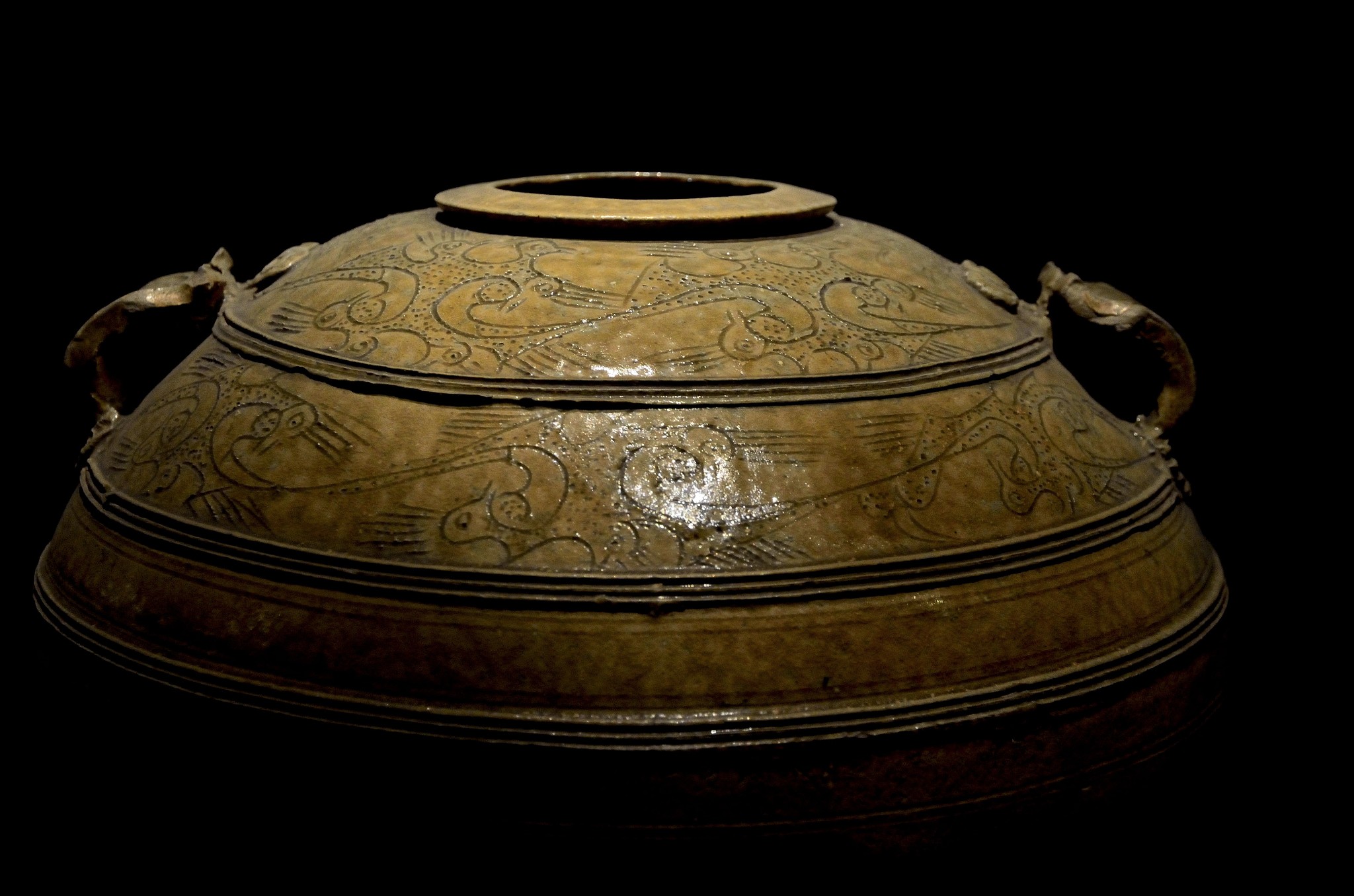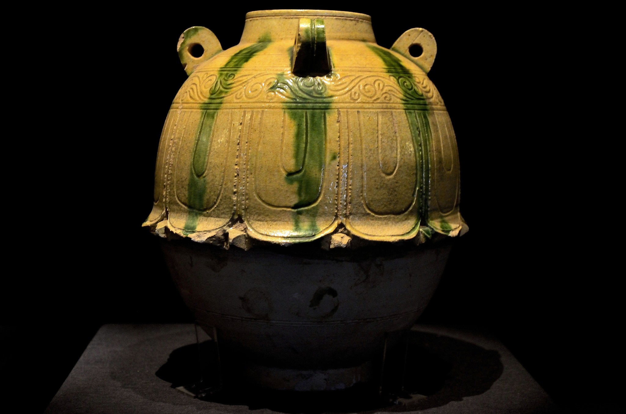铅黄釉绿彩莲瓣纹四系罐 北朝