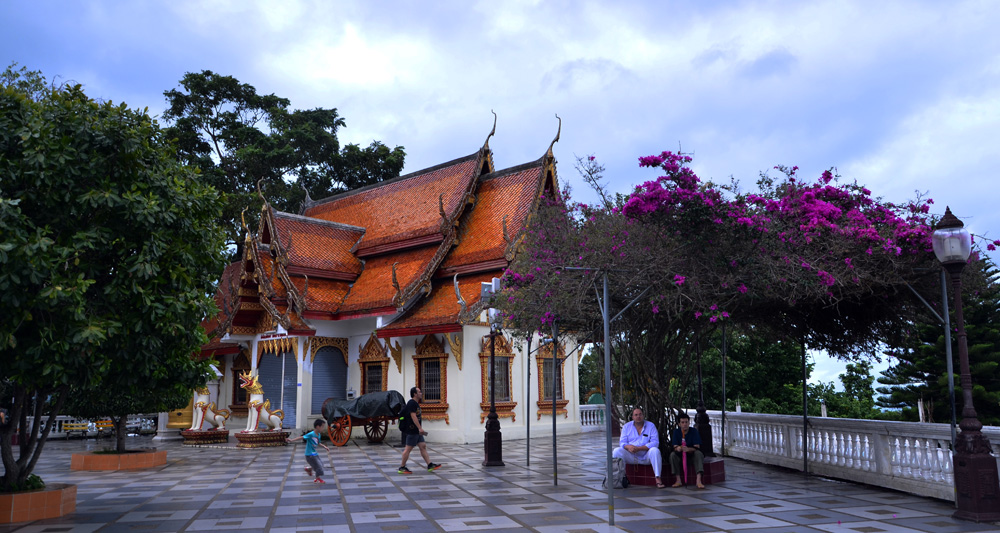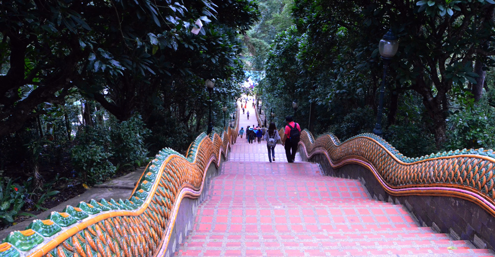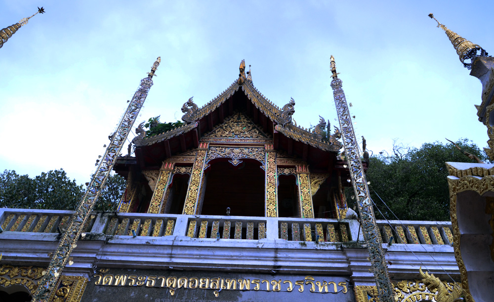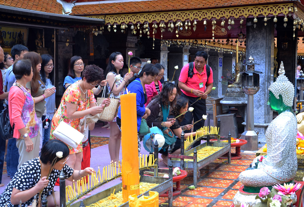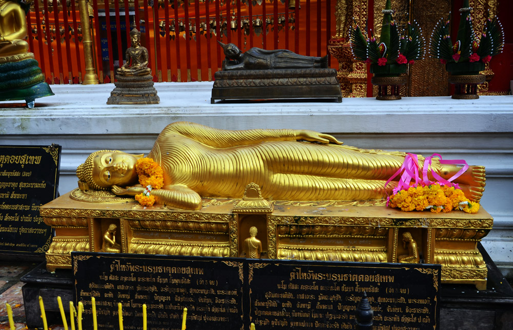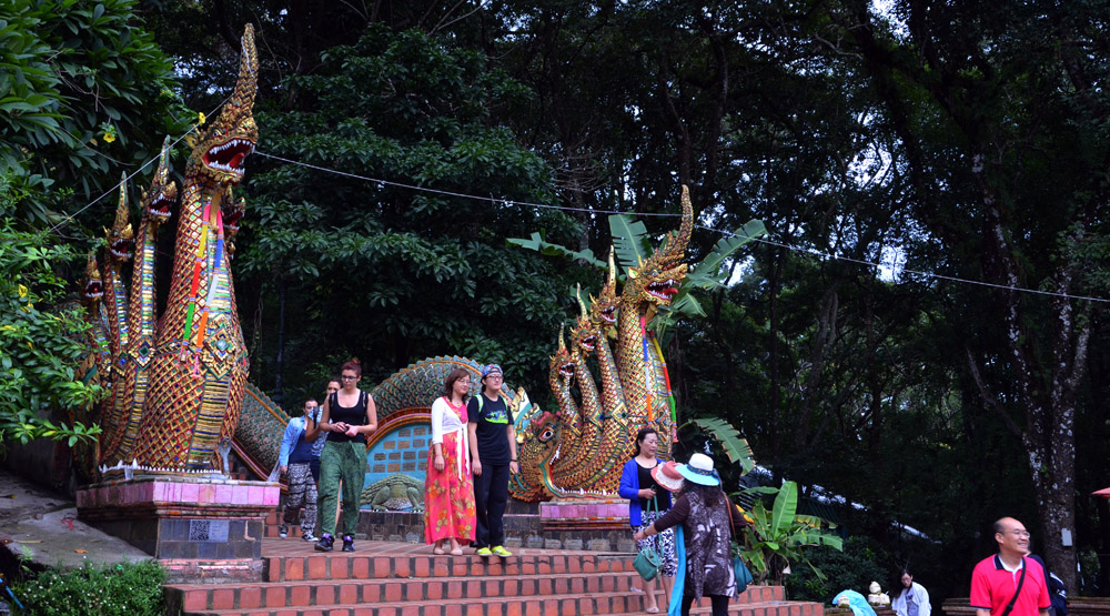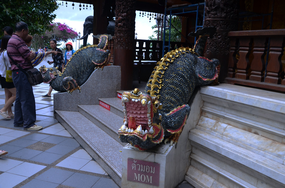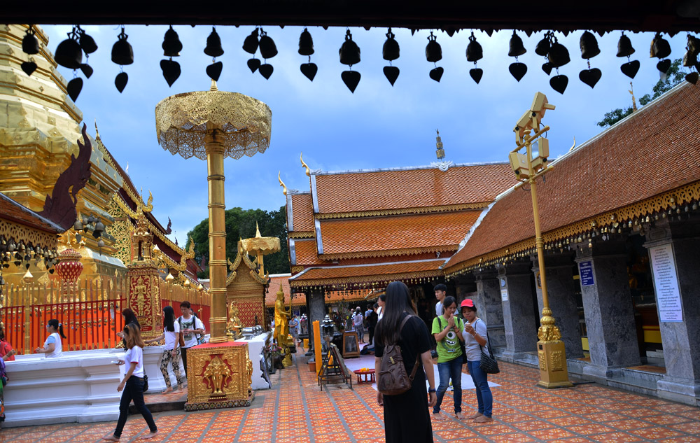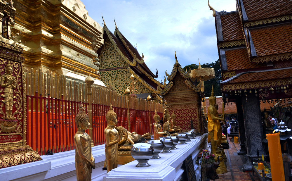 在清迈的双龙寺是泰国著名的佛教避暑胜地,因金光闪耀,在“千佛之国”的泰国享有盛誉并相当突出,它位于海拔三千多英尺上的素帖山上,由山上往下看正可俯视清迈全景,该寺是一座纯正的泰式寺庙,相传在公元一三五五年至一三八五年间,是由白象选址、皇室建造,充满传奇色彩的庙宇。传说当时有位锡兰高僧携带了几颗佛舍利到泰国,高僧为防不法之人抢夺,便将舍利放在一只白象身上,希望藉由白象来选择一处可建寺供奉舍利的福地,白象四处游走最后则在双龙寺的现址停留,于是大众才在此地建了舍利塔,因山路两旁有两只金龙守护,便以双龙寺为名。