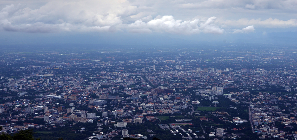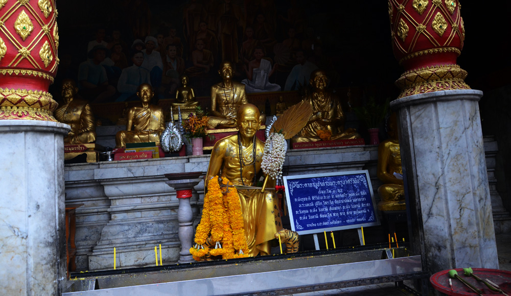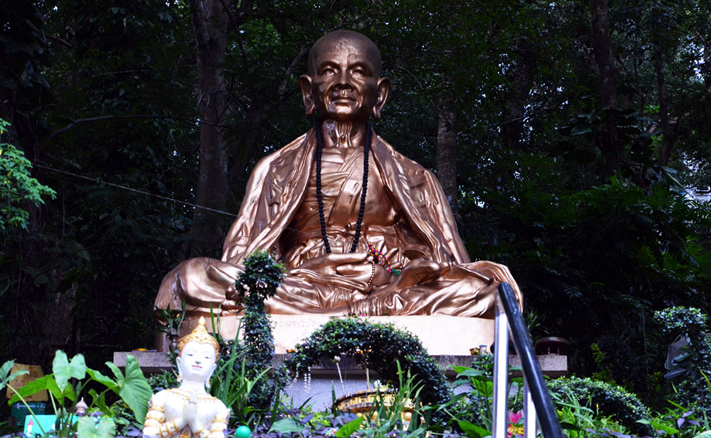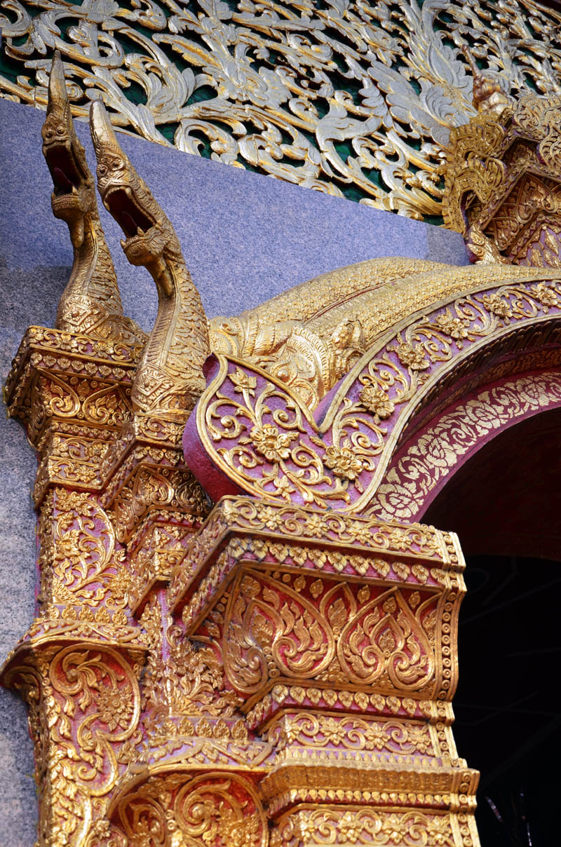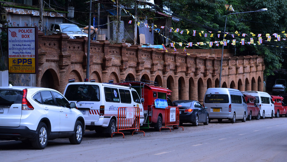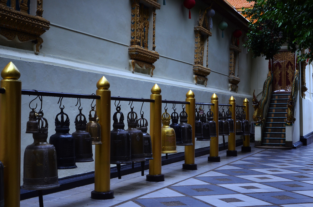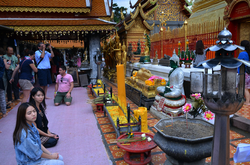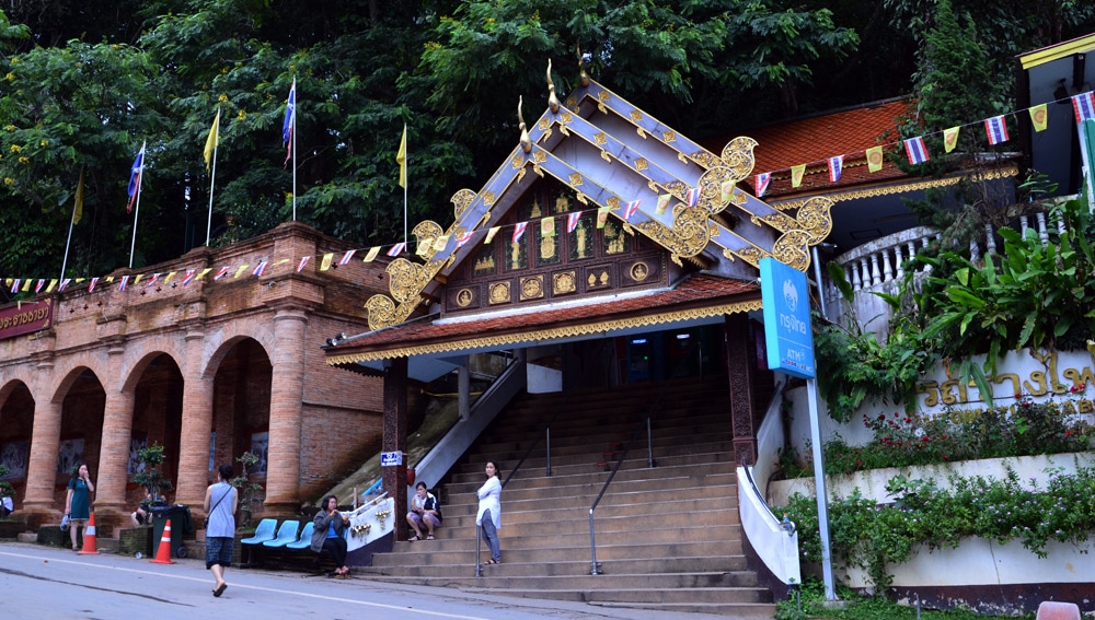 在清迈的双龙寺是泰国著名的佛教避暑胜地,因金光闪耀,在“千佛之国”的泰国享有盛誉并相当突出,它位于海拔三千多英尺上的素帖山上,由山上往下看正可俯视清迈全景,该寺是一座纯正的泰式寺庙,相传在公元一三五五年至一三八五年间,是由白象选址、皇室建造,充满传奇色彩的庙宇。传说当时有位锡兰高僧携带了几颗佛舍利到泰国,高僧为防不法之人抢夺,便将舍利放在一只白象身上,希望藉由白象来选择一处可建寺供奉舍利的福地,白象四处游走最后则在双龙寺的现址停留,于是大众才在此地建了舍利塔,因山路两旁有两只金龙守护,便以双龙寺为名。