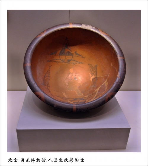 仰韶文化的彩陶图案中有大量的动物形纹饰,如鱼、鹿、蛙等,以鱼纹最为典型。人面鱼纹彩陶盆是公认的彩陶艺术精品。类似内容的彩陶盆在遗址中出土了很多件,多作为儿童瓮棺的棺盖来使用,很像一种特制的葬具。人面由人鱼合体而成,人头装束奇特,像是进行某种宗教活动的化妆形象,具有巫师的身份特征,因此这类图画一般被认为象征着巫师请鱼神附体,为夭折的儿童招魂祈福。也有人认为人面与鱼纹共存构成人鱼合体,寓意鱼已经被充分神化,可能是作为图腾来加以崇拜。