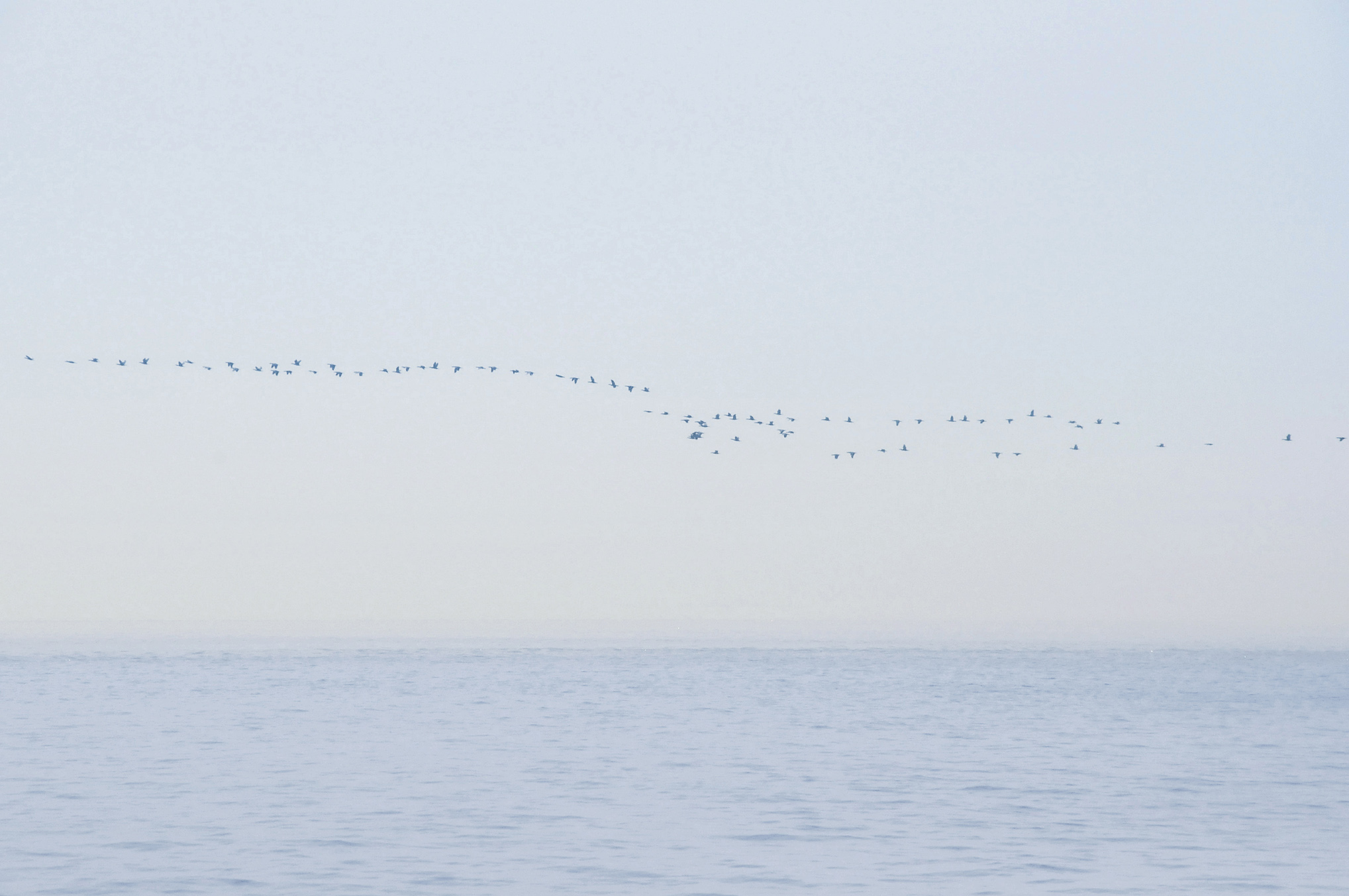 船窗外大部分时间都是茫茫一片、几乎要混为一体的天空和大海,却还是很惊喜地偶遇了“一行大雁往南飞”的大场面