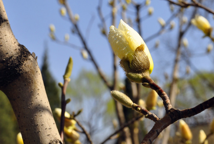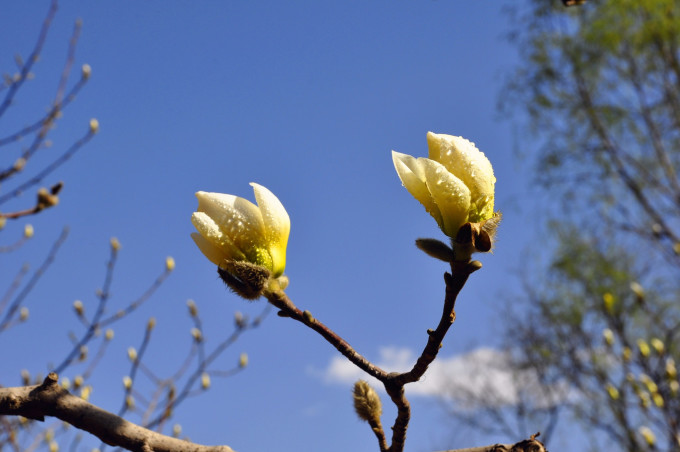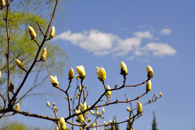 蓝天白云飘,柳梢嫩绿黄。春风拂万物,百花含苞放。