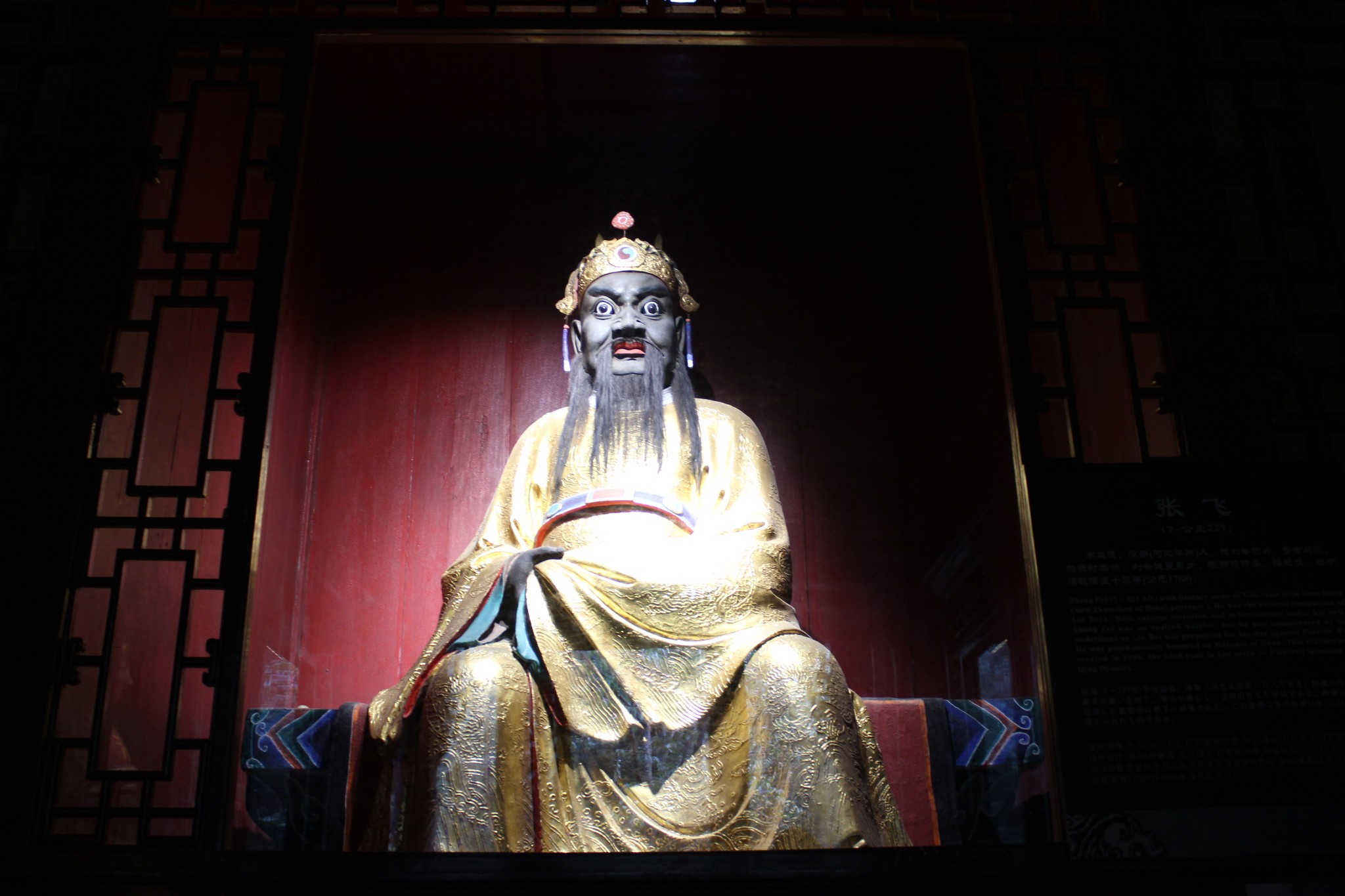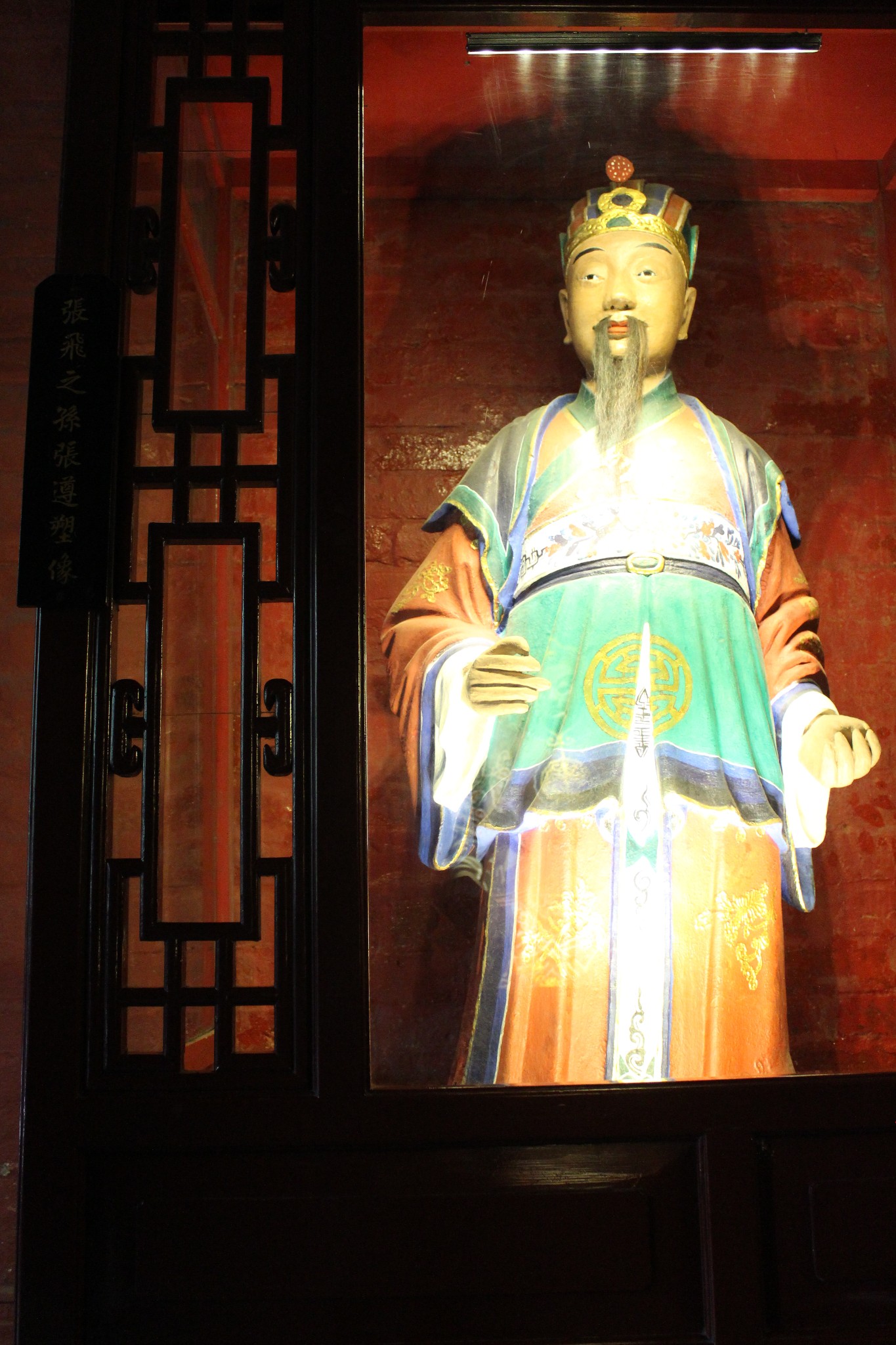 【西偏殿】是张飞祖孙三代的塑像。张飞面色漆黑,豹头环眼。相貌威猛而有生气。