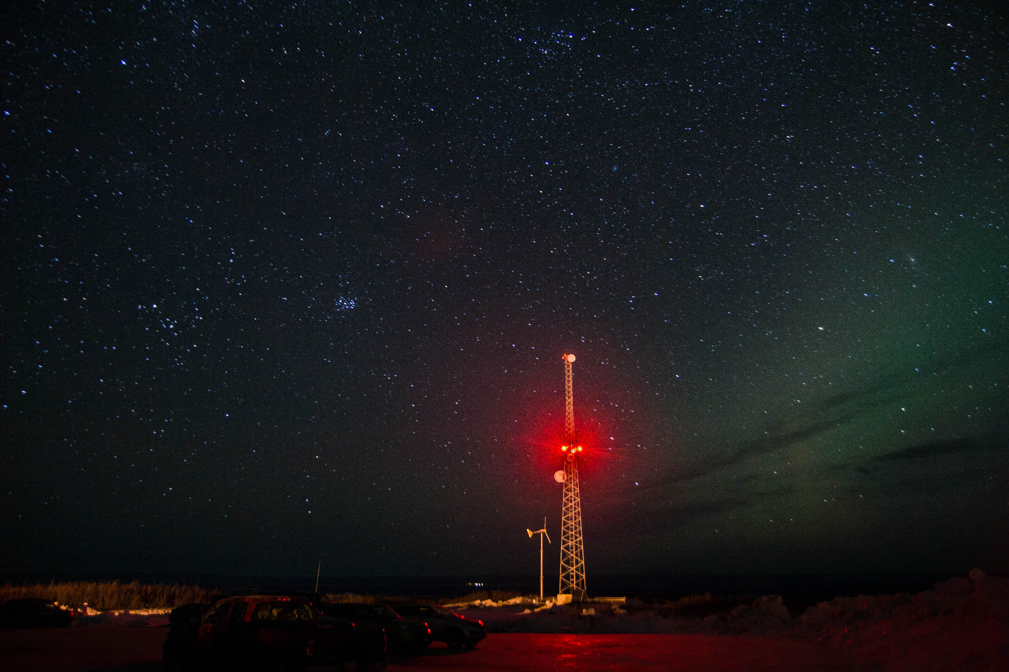 3. Murphy Dome:之前在网上查的Murphy Dome比Ester Dome更远,地势更高,感觉效果应该会更好,于是从Cleary Summit出来就直奔Murphy Dome,车程四五十分钟吧。本来希望Murphy Dome车能少一点的,结果一到那里就傻眼了,大概有十几辆车已经在山顶上踩好点了,大家都坐在各自的车上静静地等极光。由于所有车车灯都是关着的,感觉不太好意思打手电拍照,怕影响别人。而且山顶上有天文台和电视塔,上面的灯光很强烈,感觉影响了看极光的效果。失望的我又研究起了谷歌地图的地形图,跟小伙伴们商量后抱着试试看的心态往 Old Murphy Dome Rd 开。事实证明我们的选择是对的!我们在 Old Murphy Dome Rd 这条鲜为人知的路上无意中发现了一个超级隐蔽的极佳观测点!这条老路上几乎一辆路过的车都没有,整条路都是我们的地盘了!