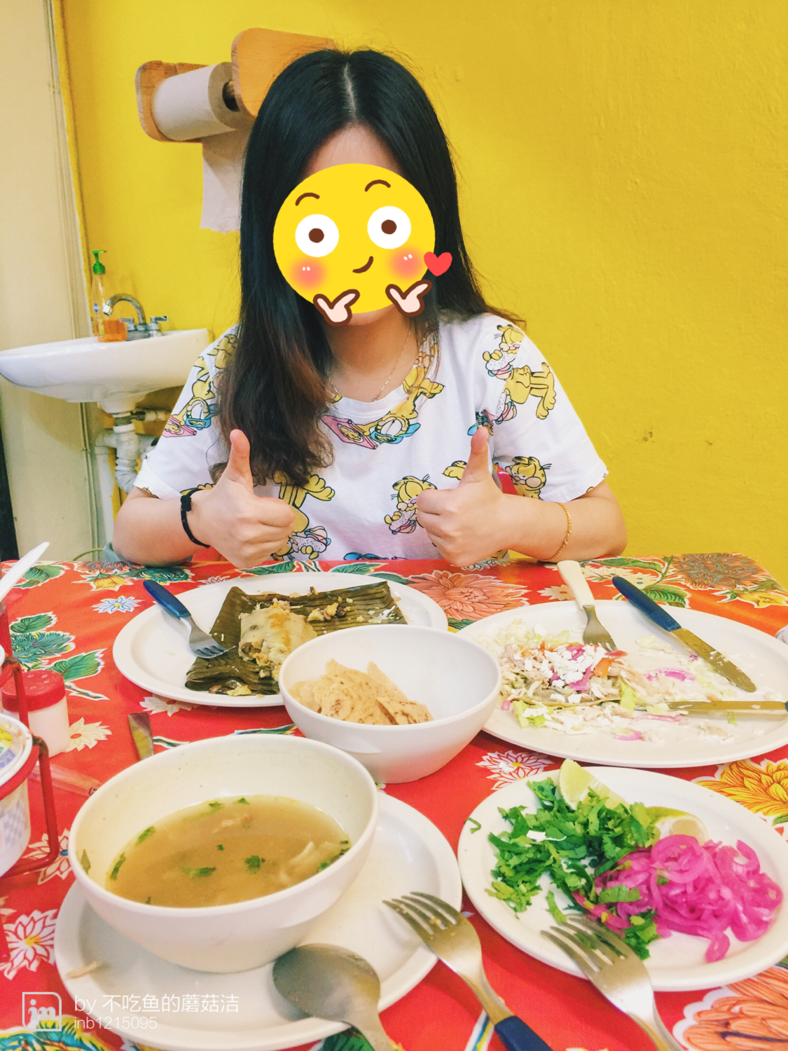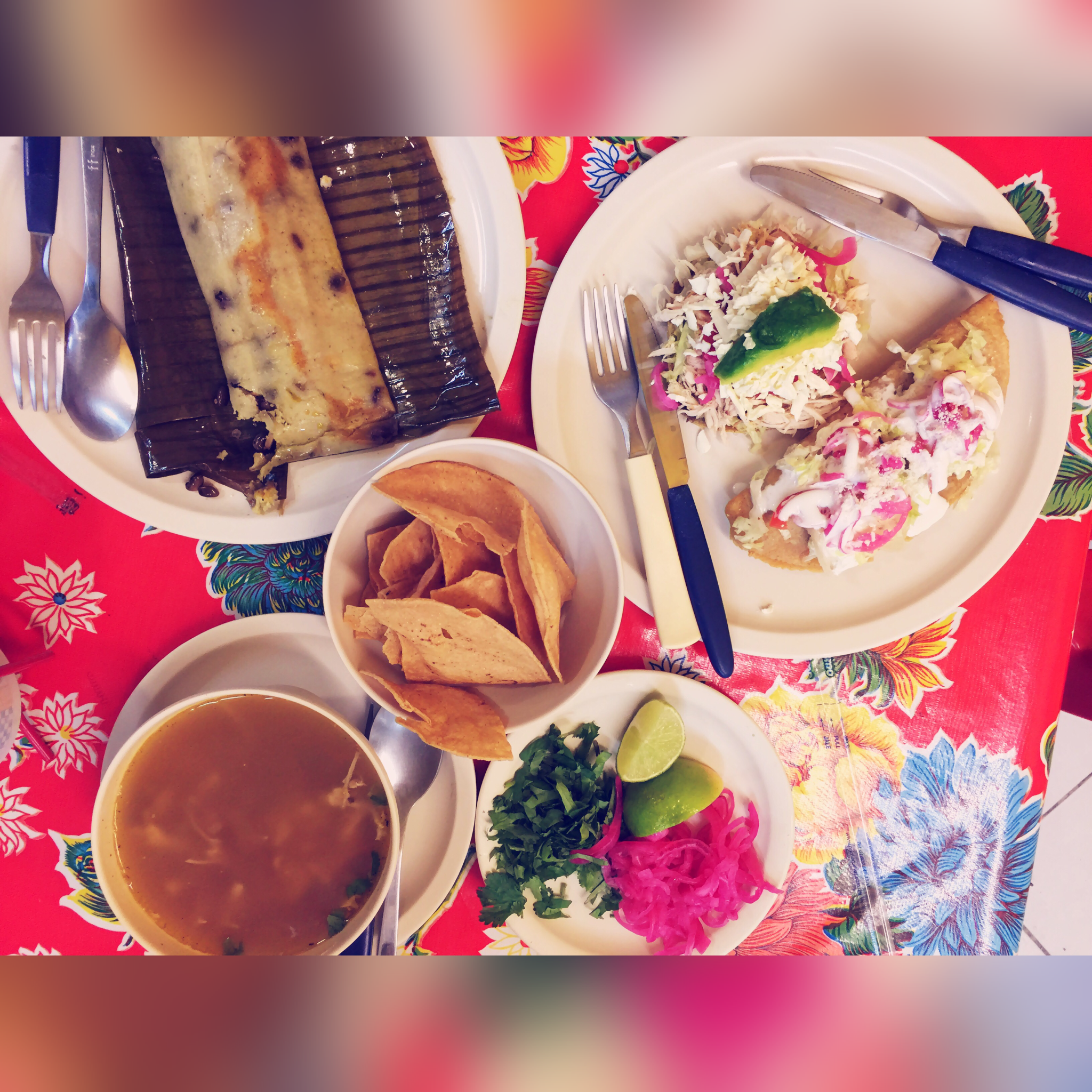 晚间想要自己觅食 体验体验当地的食物 在yelp上找了一家评价很好的墨西哥菜餐馆 天完全黑了 再加上一直听说墨西哥治安不太好 其实心里有点害怕的 一路快走加小跑 好不容易找到以后竟然没开门 在回去的路上遇到一家挺多人在吃的当地小菜馆 进去先问老板 Can u speak English? 老板竟然不会说 原本以为这里的人多多少少都会说一点的 菜单全是西班牙语 一个也看不懂 好在有个当地妇女 十分好心的给我们介绍和解释 虽然她英语也不太好 但是花了近半小时的时间 非常详细的给我们解释了每一道菜 还帮我们把点的菜单转达给老板 真是非常非常非常感谢 最后我们选择了Panucho con queso、Empanada、Caldo de pavo(soup)、Tamal espelon, 三菜一汤 汤真的很好喝!咸咸的 肉也非常多 很对我的胃口啦 一顿下来两个人一共120比索 平均下来一个人只花了三刀左右 最地道的才是最值得尝试的 菜一上来我两就各种拍拍拍 还站起来拍 其他人不停看我们感觉和我们围观境外人吃火锅一个样子 哈哈哈哈 店员和顾客真的都很美好 完美的第一天就结束咯