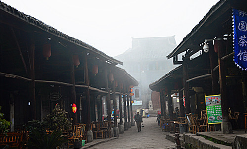 古镇的清晨被薄雾淡淡地笼罩着,早起的人们已经在准备开始一天的生意。灯笼的微光使安静的古街有一种朦胧安详的暖意。