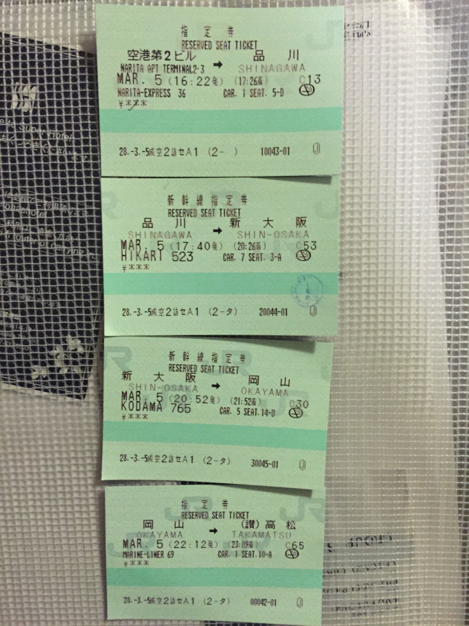 这是猫第四回去日本了,三晚京都三晚东京是集体行程,于是前面还剩刚到日本的三晚是自由时间。纠结了很久这三晚能去哪里了,最后因为想尝试一下没有去过的四国于是锁定了高松和濑户内的小岛(原本有计划去丰岛但是当天雾大去丰岛的渡轮全都停了)。因为机票买的是费城—东京来回,于是第一天坐了十几小时(中间还在芝加哥转了个机)的灰机大概在下午一两点的时候到了成田机场。刷刷刷地去机场邮局拿好提前寄到的b-mobile上网卡设置好网络,去JR办事处把一个月前就买好的JR Pass七日票换了实体票。热情的不要不要的JR阿姨还帮猫把第一天的车票都出了——当她知道猫要在当天感到高松的时候也是震惊了,看下图猫分别在品川、新大阪、冈山转了四班车,最后大概在晚上十一点多才从高松站打了辆车到了酒店_(:зゝ∠)_