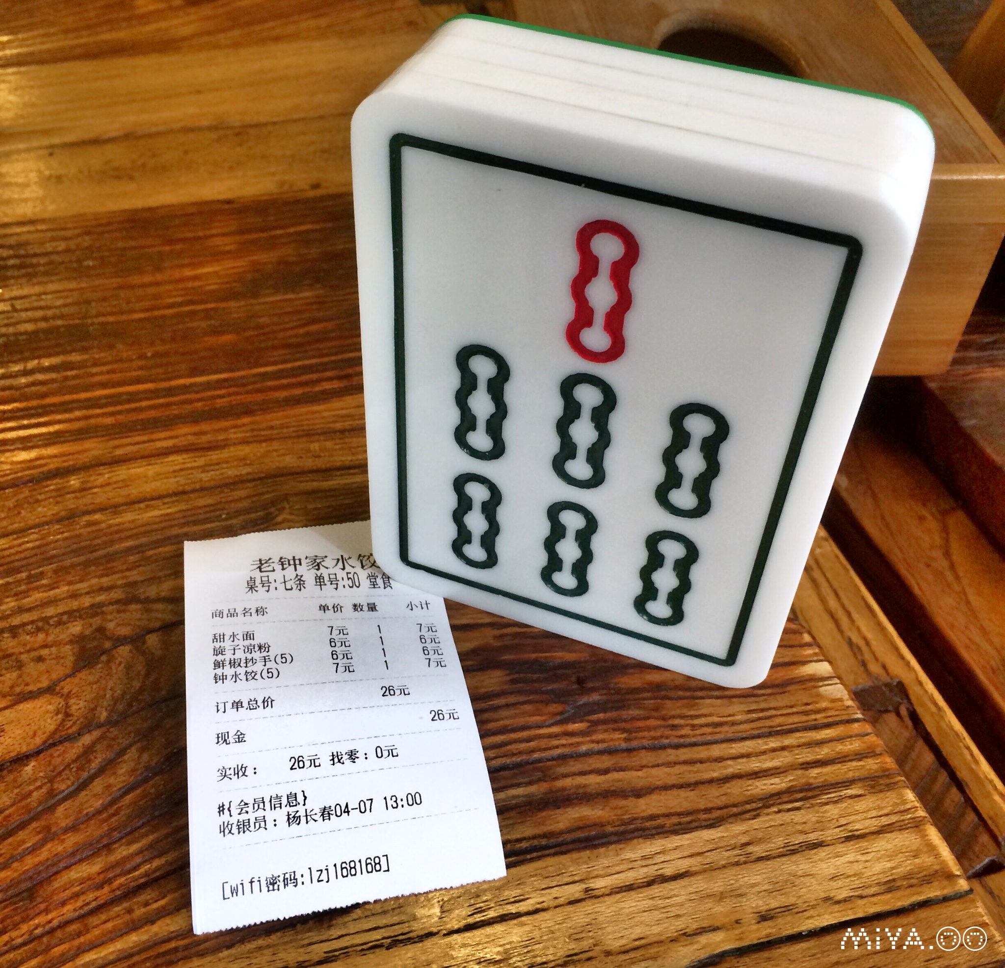 老钟家进食的人不算多 不过陆陆续续一直有人来~ 点完单会给你一个巨型麻将 也是你的桌号~ 但是 童鞋们 请不要随便把玩它 万一他坏了 你需要含泪掏60块大洋~ 60块够把你吃成钟水饺了~