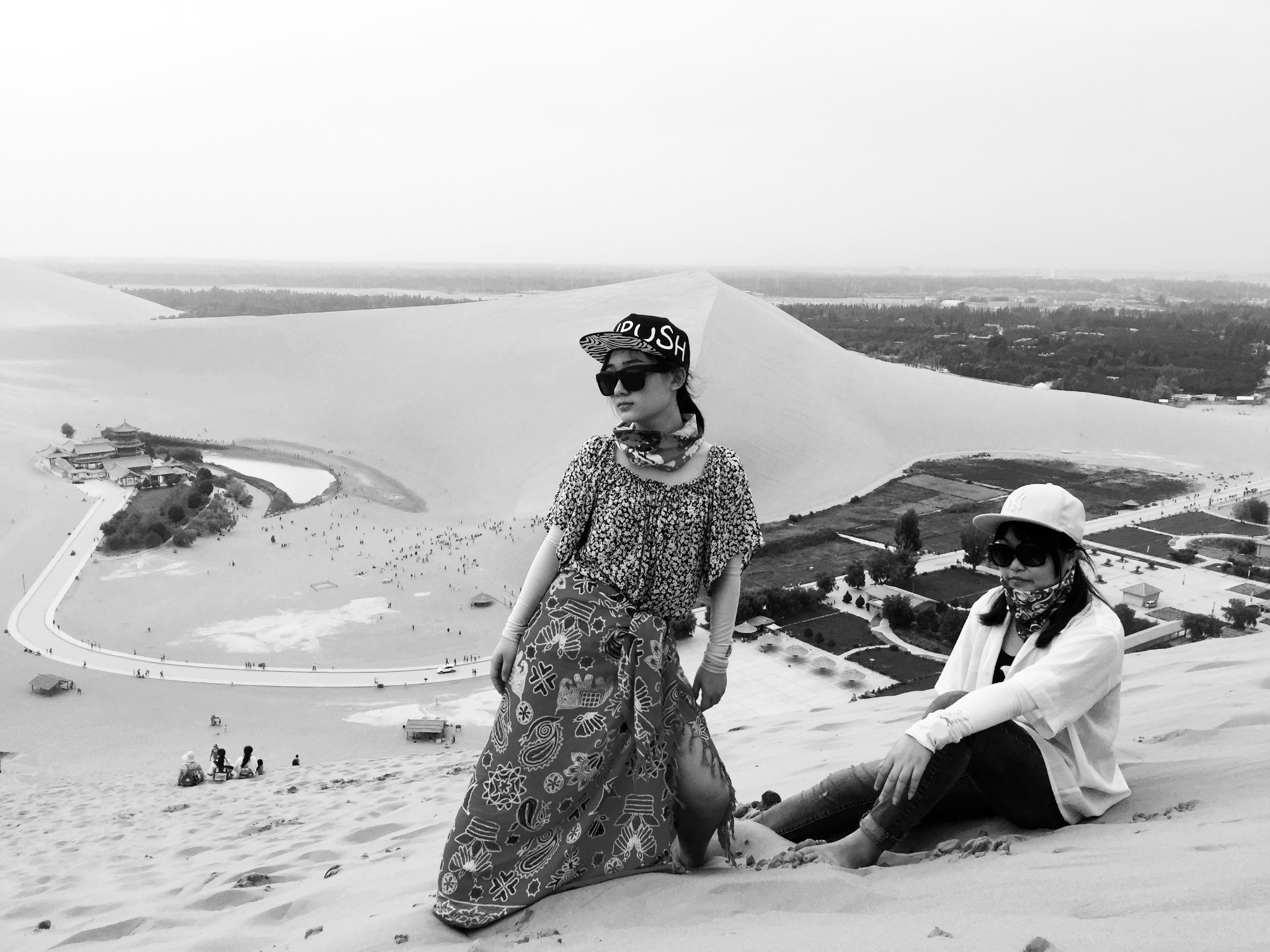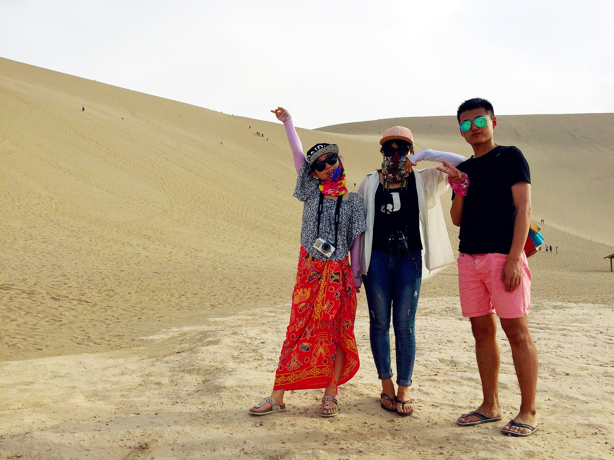 鸣沙山到沙漠千万要记得把自己包成粽子。墨镜头巾必不可少,别管美不美了,你看看晒成最右的腿那么黑美不美!???